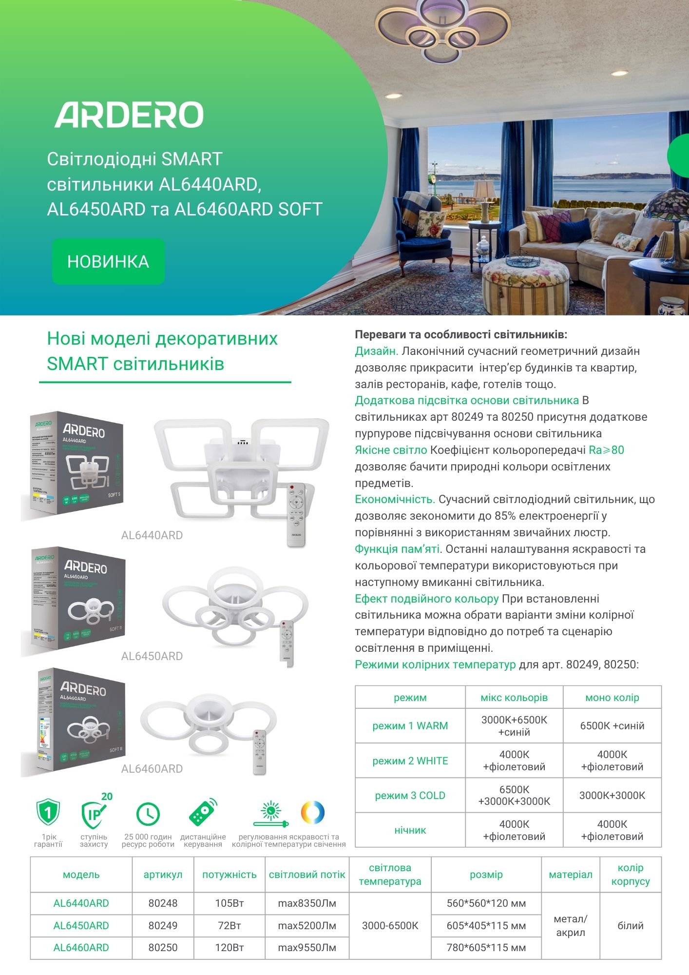 | Корельована колірна температура, K | 3000-6500 |