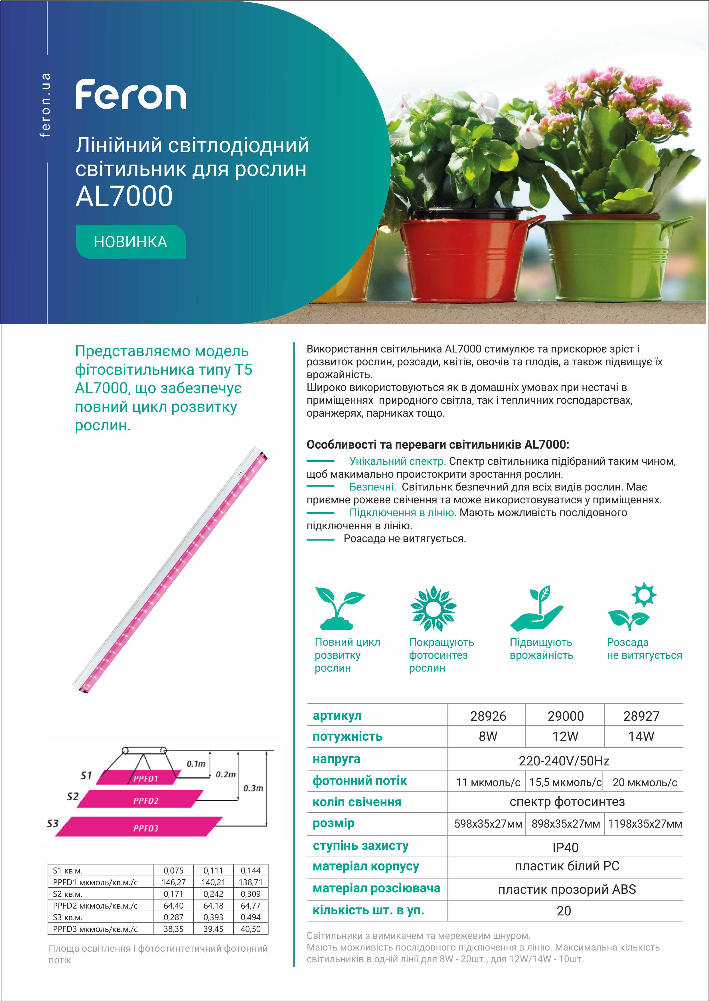 Використання світильника AL7000 стимулює та прискорює зріст і розвиток рослин, розсади, квітів, овочів та плодів, а також підвищує їх врожайність. Широко використовуються як в домашніх умовах при нестачі в приміщенні природного світла, так і тепличних господарствах, оранжереях, парниках тощо. Спектр свічення світильника підібраний таким чином , щоб максимально прискорити зростання рослин. Світильник безпечний для всіх видів рослин, він має приємне рожеве свічення та може використовуватися у приміщеннях. Також світильники мають можливість послідовного підключення в лінію.