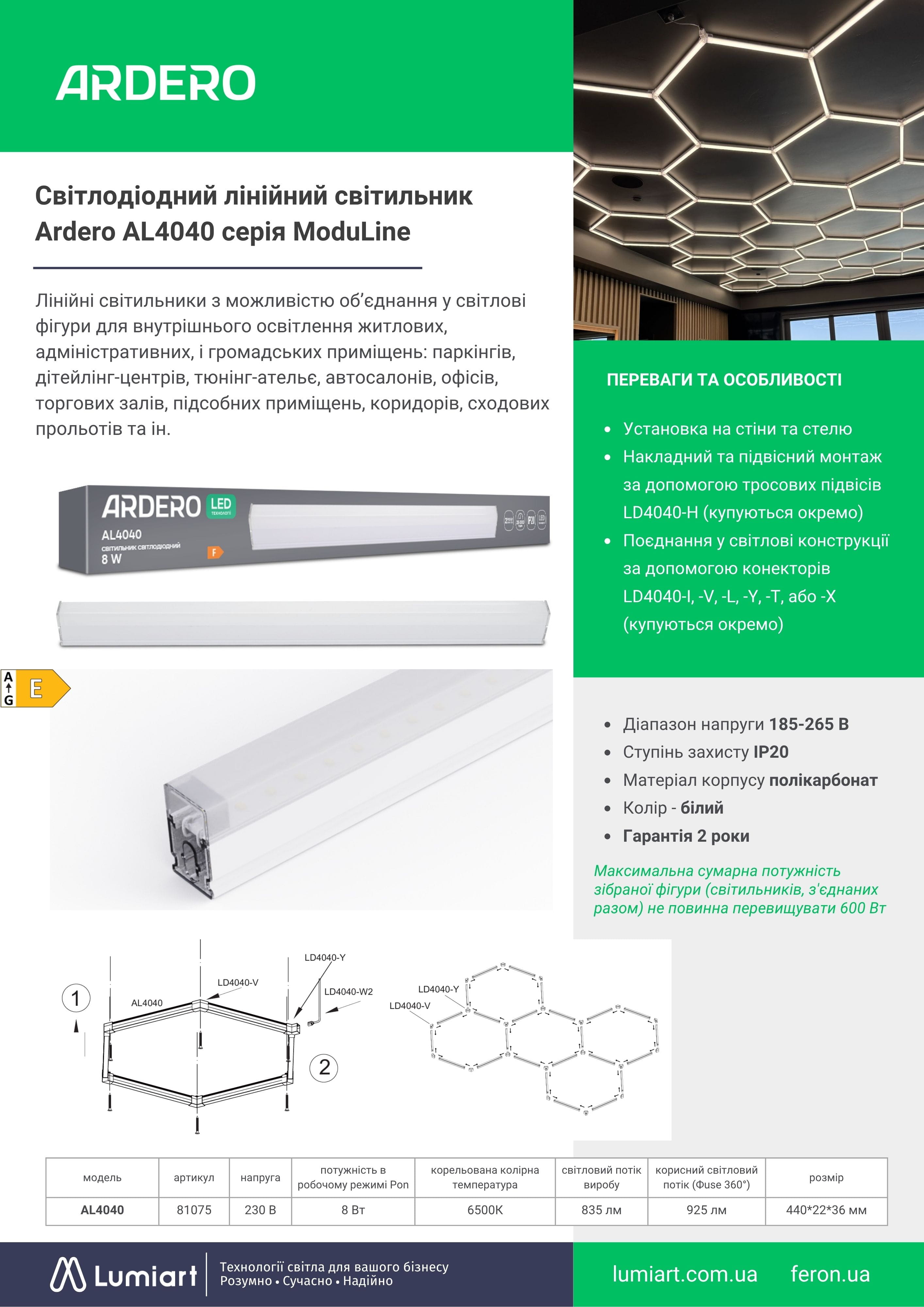 Світлодіодні лінійні світильники Ardero AL4040 ModuLine — це сучасне рішення для створення індивідуальних світлових систем будь-якої складності. Завдяки модульному принципу та широкому набору конекторів, світильники дозволяють формувати геометричні світлові фігури на стелі та стінах, що робить їх ідеальними для комерційних, технічних і дизайнерських просторів.