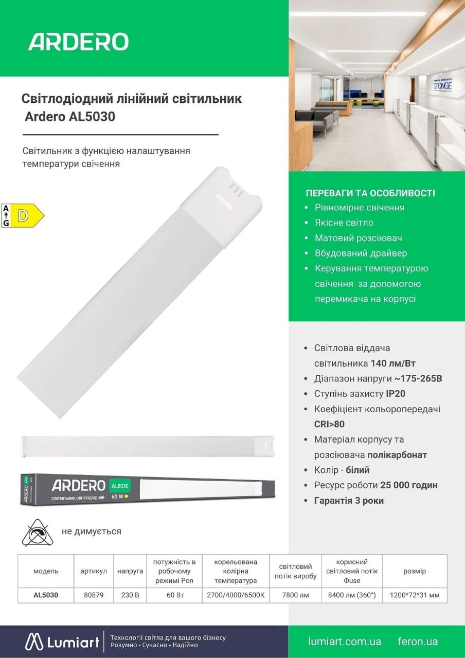 Ardero AL5030 — це поєднання функціональності, енергоефективності та сучасного дизайну для стабільного й комфортного освітлення щодня.