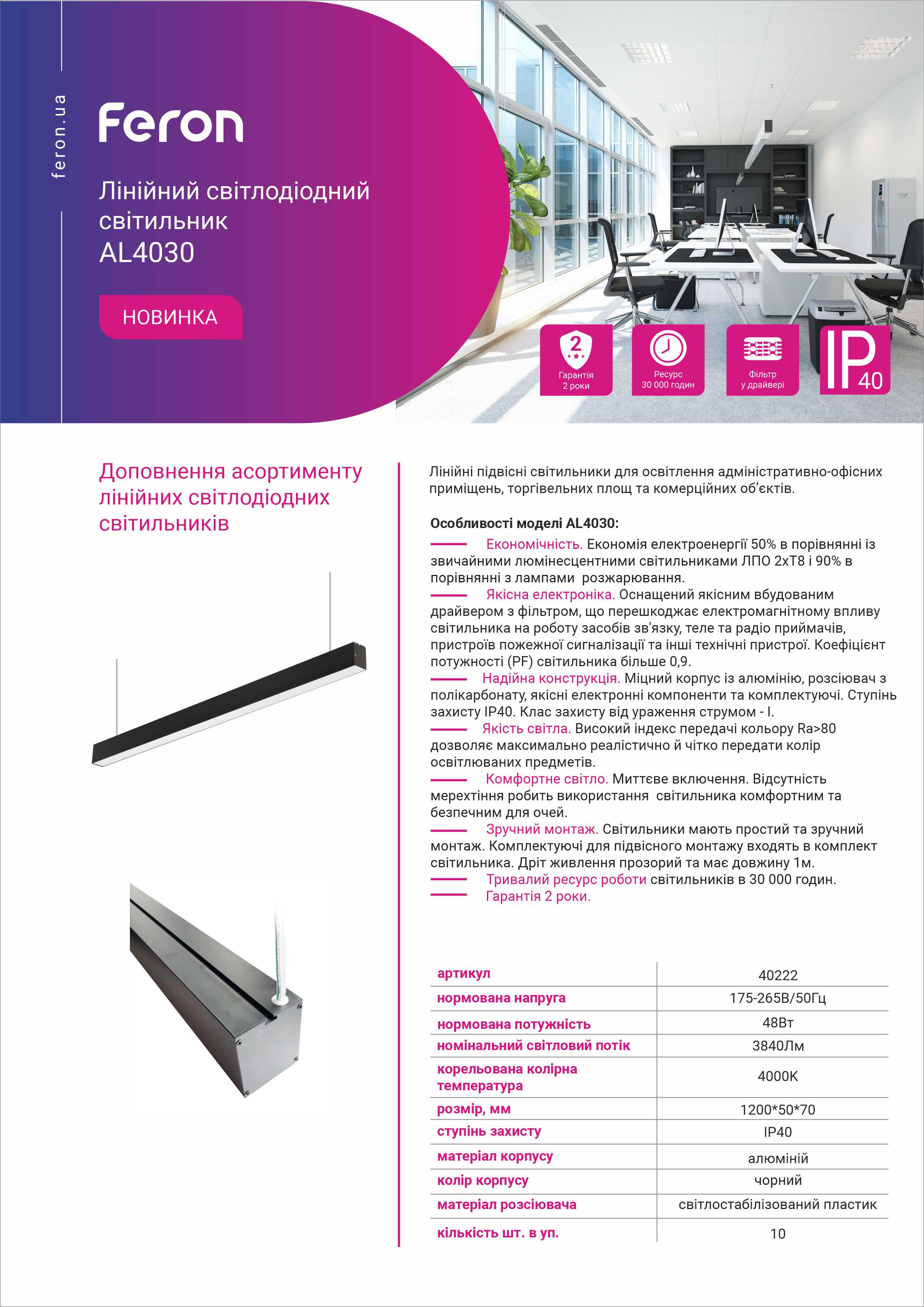 Лінійні підвісні світильники для освітлення адміністративно-офісних приміщень, торгівельних площ та комерційних об’єктів.