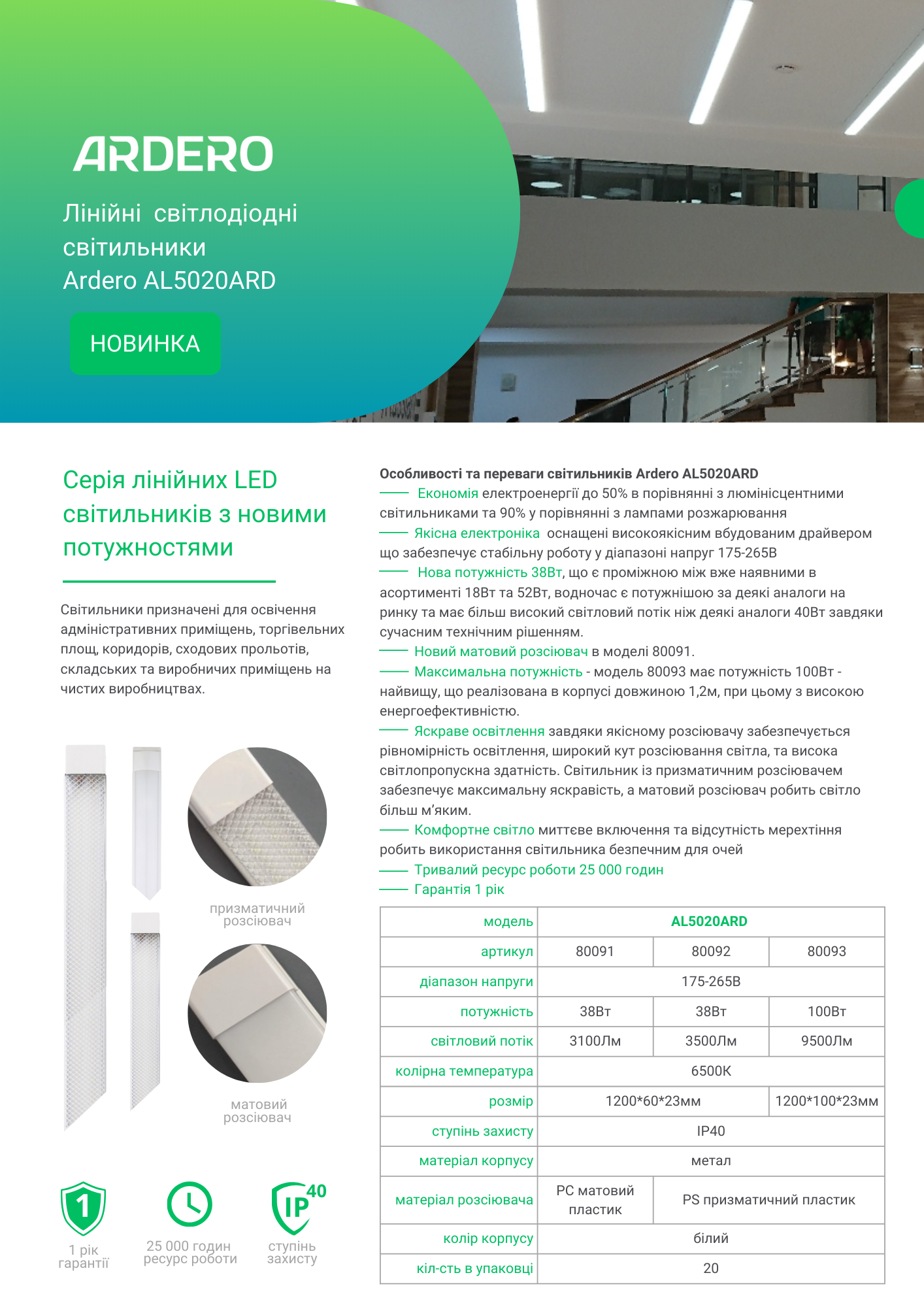 Максимальна потужність - модель 80093 має потужність 100Вт - найвищу, що реалізована в корпусі довжиною 1,2м, при цьому з високою енергоефективністю.
