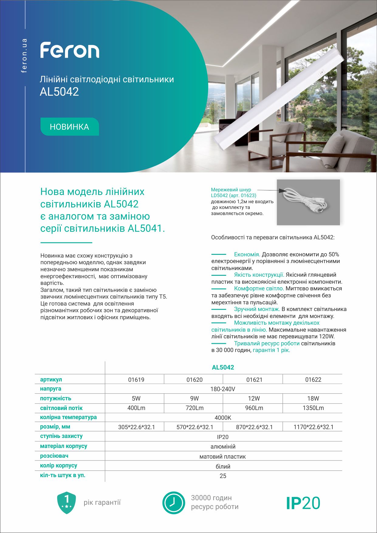 Аналог люмінесцентного світильника типу Т5, з розсіювачем та вимикачем. Використання світлодіодного світильника дозволяє зекономити 50% електроенергії у порівнянні з люмінесцентними лампами. Має значний ресурс роботи в 30 000 годин, завдяки використанню передових технологій виробництва та сучасних матеріалів і комплектуючих. Це екологічний світильник - в ньому відсутні інфрачервоні на УФ випроміннювання. Світильник вмикається миттєво та забезпечує рівномірне, яскраве, стабільне свічення без мерехтіння. Стильний світильник з якісного глянцевого пластику знайде своє місце в будь-якому інтер'єрі. Існує можливість монтажу декількох таких світильників в лінію, завдяки наявності з'єднувальних гнізд.
