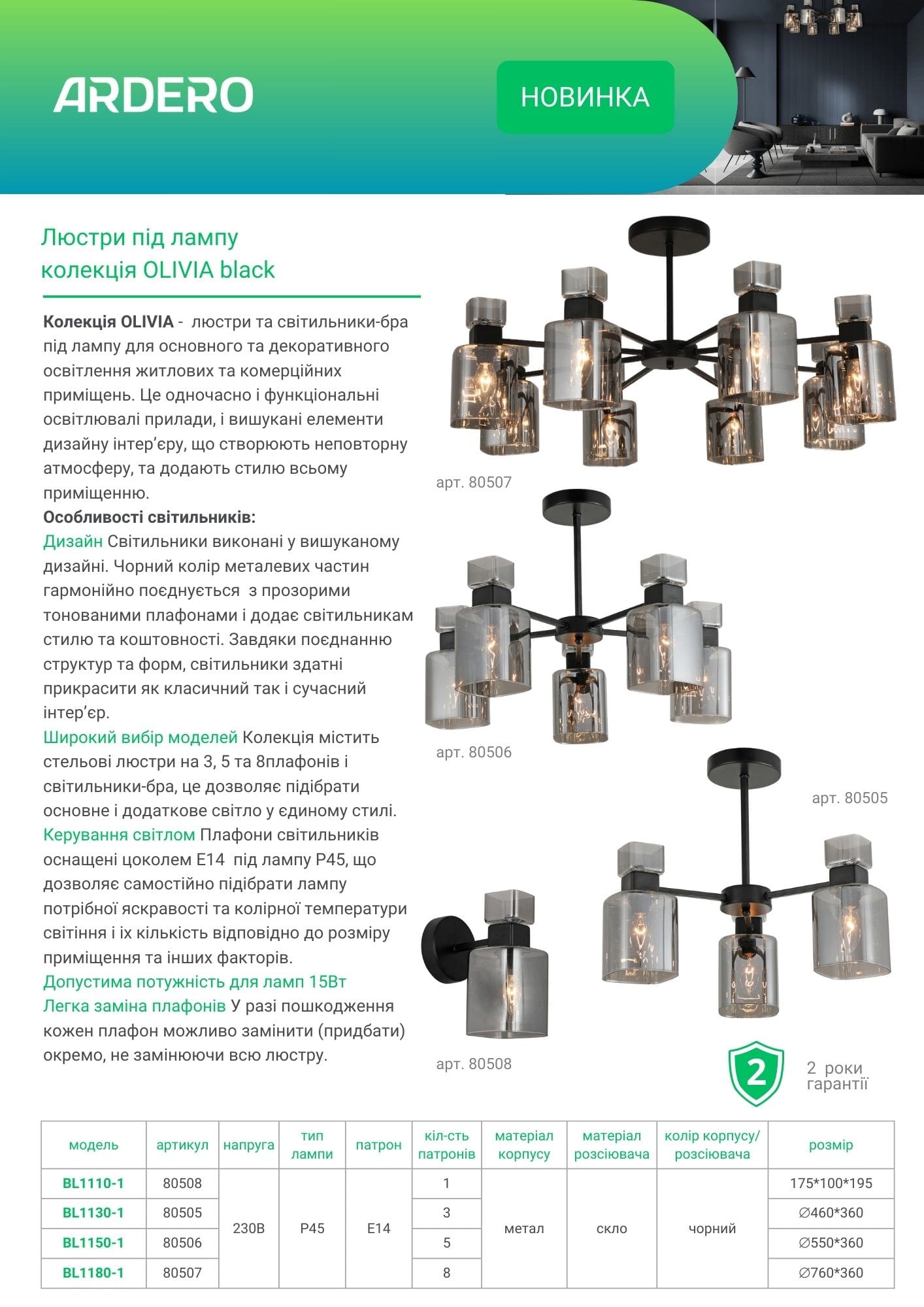 Колекція OLIVIA - люстри та світильники-бра під лампу для основного та декоративного освітлення житлових та комерційних приміщень. Це одночасно і функціональні освітлювальні прилади, і вишукані елементи дизайну інтер’єру, що створюють неповторну атмосферу, та додають стилю всьому приміщенню.
