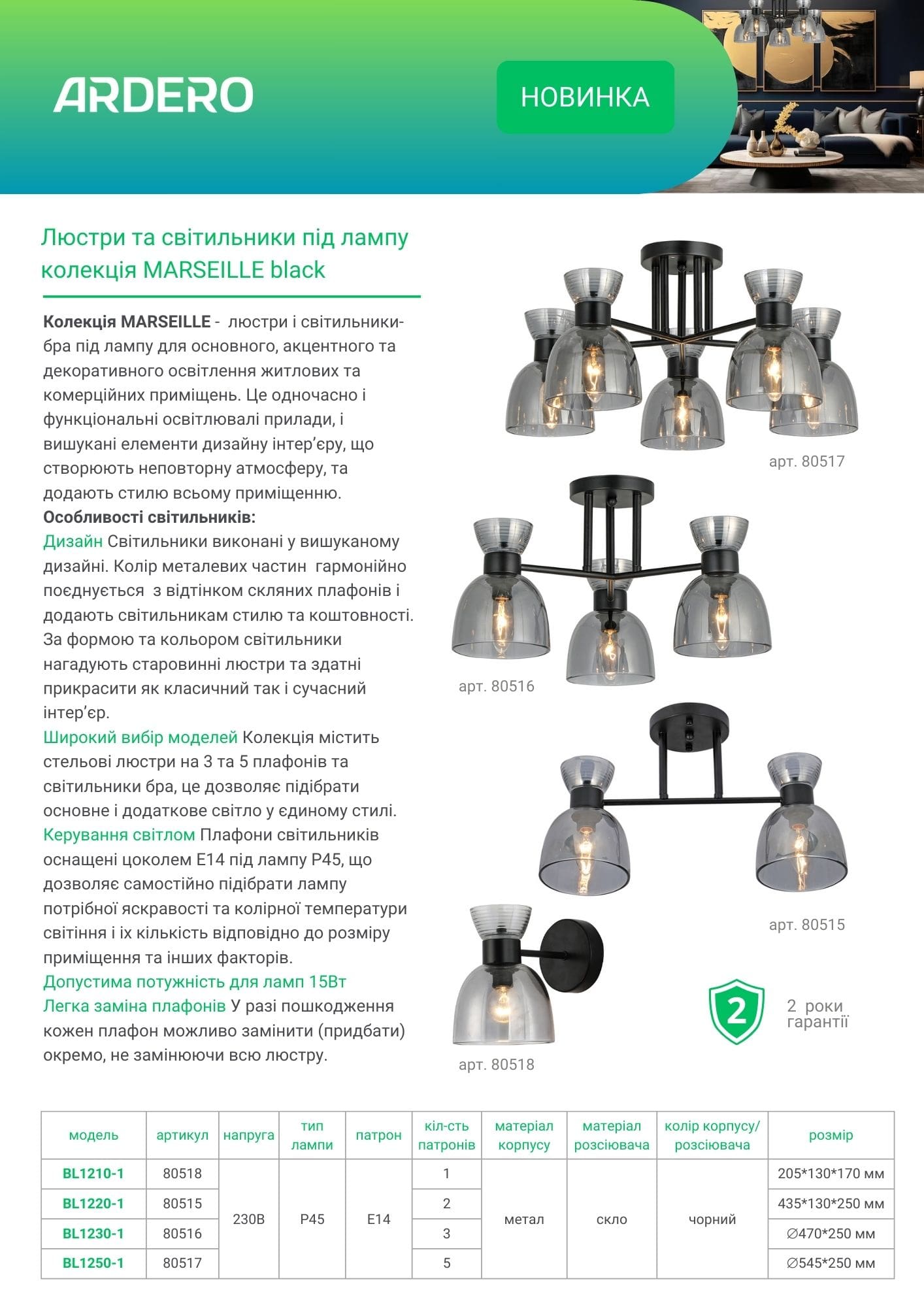 Колекція MARSEILLE - люстри та світильники-бра під лампу для основного, акцентного та декоративного освітлення житлових та комерційних приміщень. Це одночасно і функціональні освітлювальні прилади, і вишукані елементи дизайну інтер’єру, що створюють неповторну атмосферу, та додають стилю всьому приміщенню.