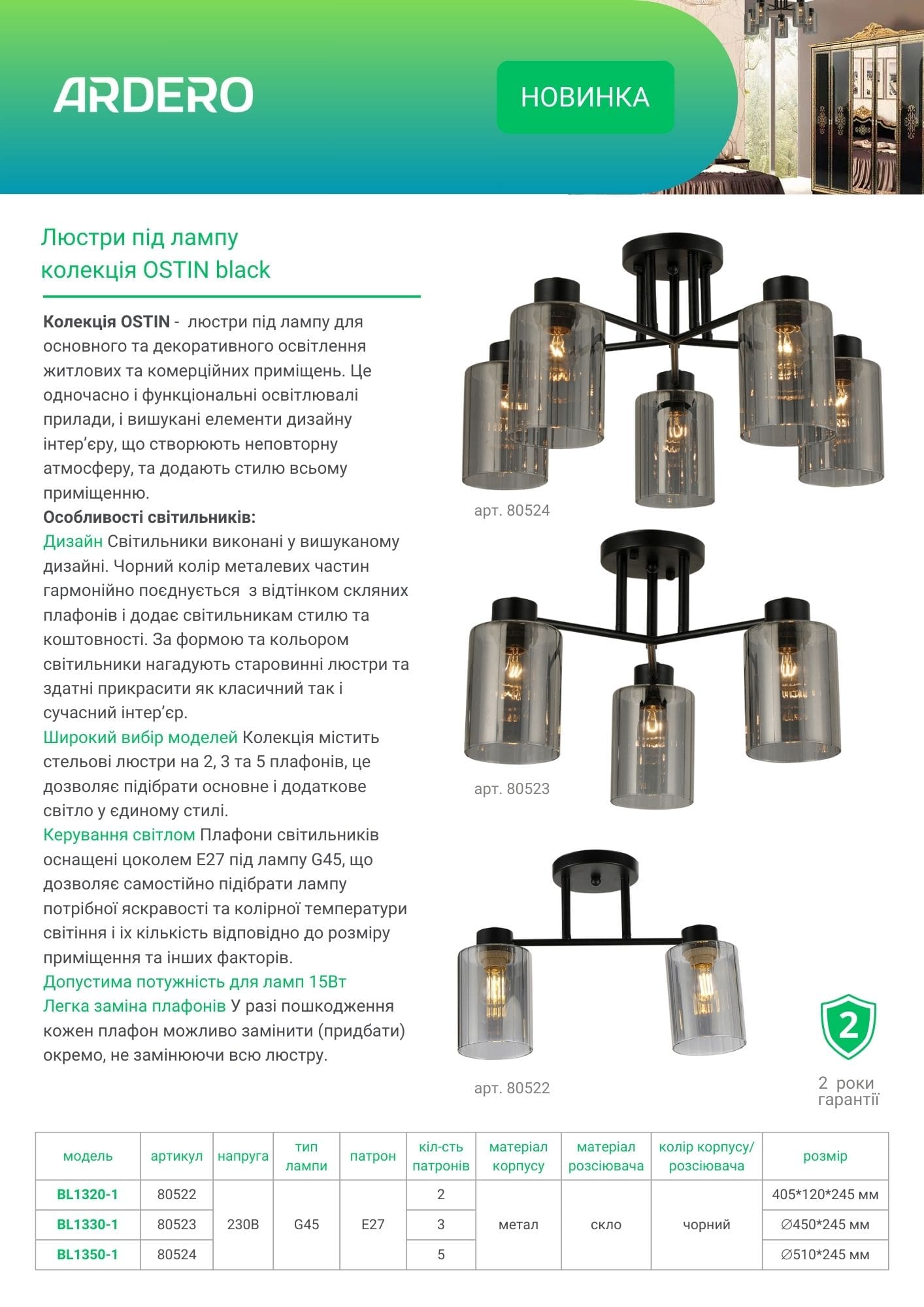 Колекція OSTIN - люстри під лампу для основного та декоративного освітлення житлових та комерційних приміщень. Це одночасно і функціональні освітлювальні прилади, і вишукані елементи дизайну інтер’єру, що створюють неповторну атмосферу, та додають стилю всьому приміщенню.