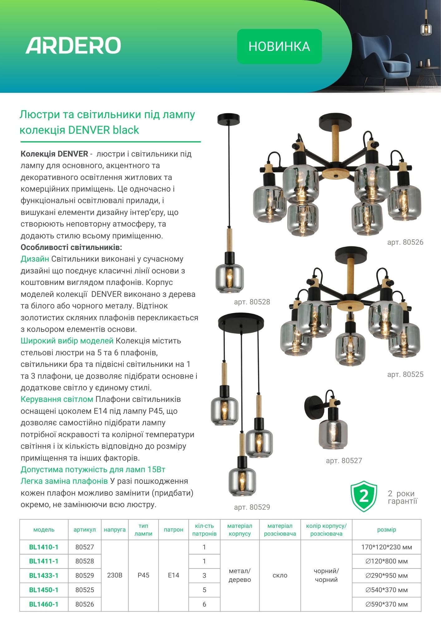 Колекція DENVER - люстри та світильники під лампу для основного, акцентного та декоративного освітлення житлових та комерційних приміщень. Це одночасно і функціональні освітлювальні прилади, і вишукані елементи дизайну інтер’єру, що створюють неповторну атмосферу, та додають стилю всьому приміщенню.