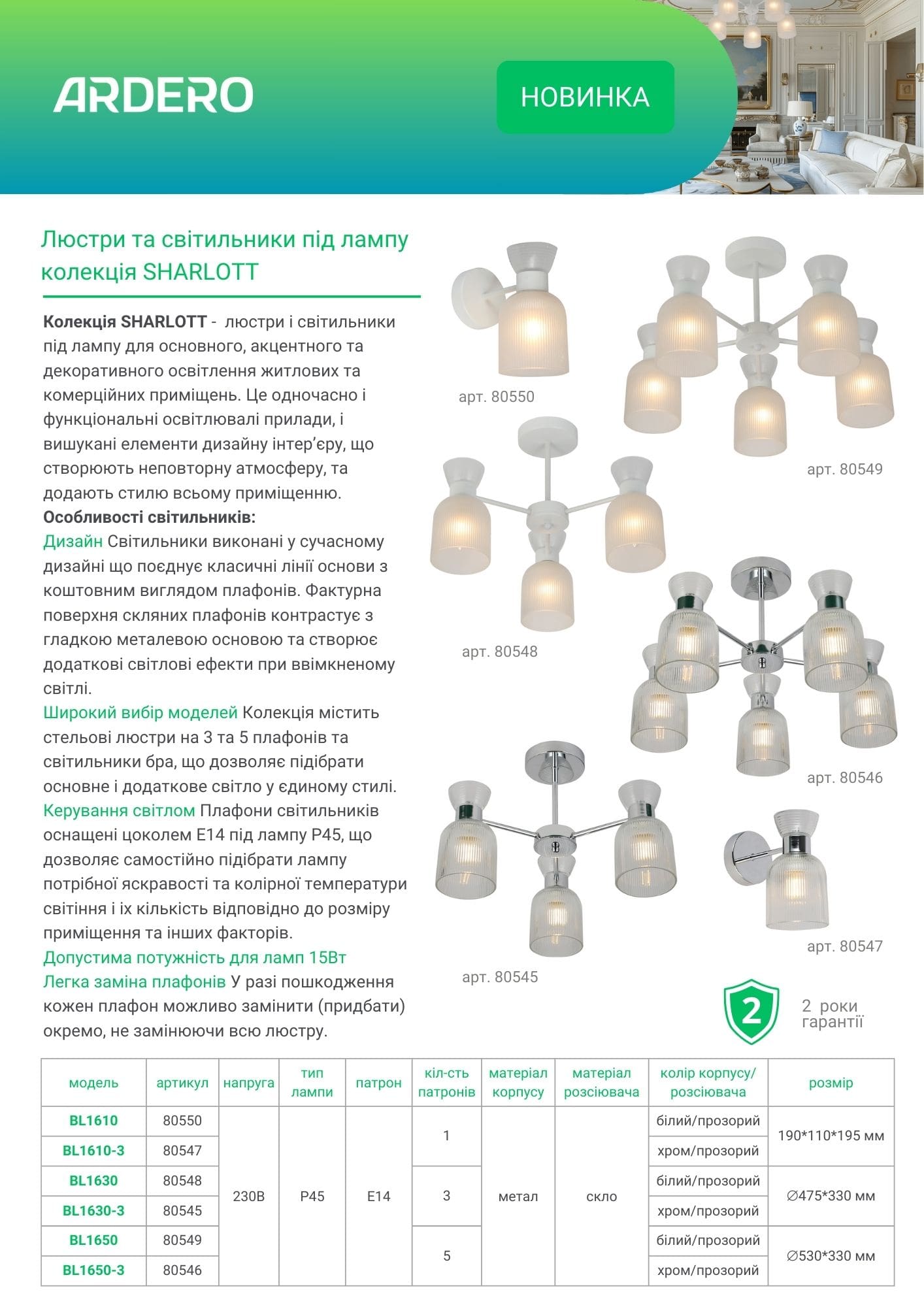 Колекція SHARLOTT - люстри та світильники під лампу для основного, акцентного та декоративного освітлення житлових та комерційних приміщень. Це одночасно і функціональні освітлювальні прилади, і вишукані елементи дизайну інтер’єру, що створюють неповторну атмосферу, та додають стилю всьому приміщенню.
