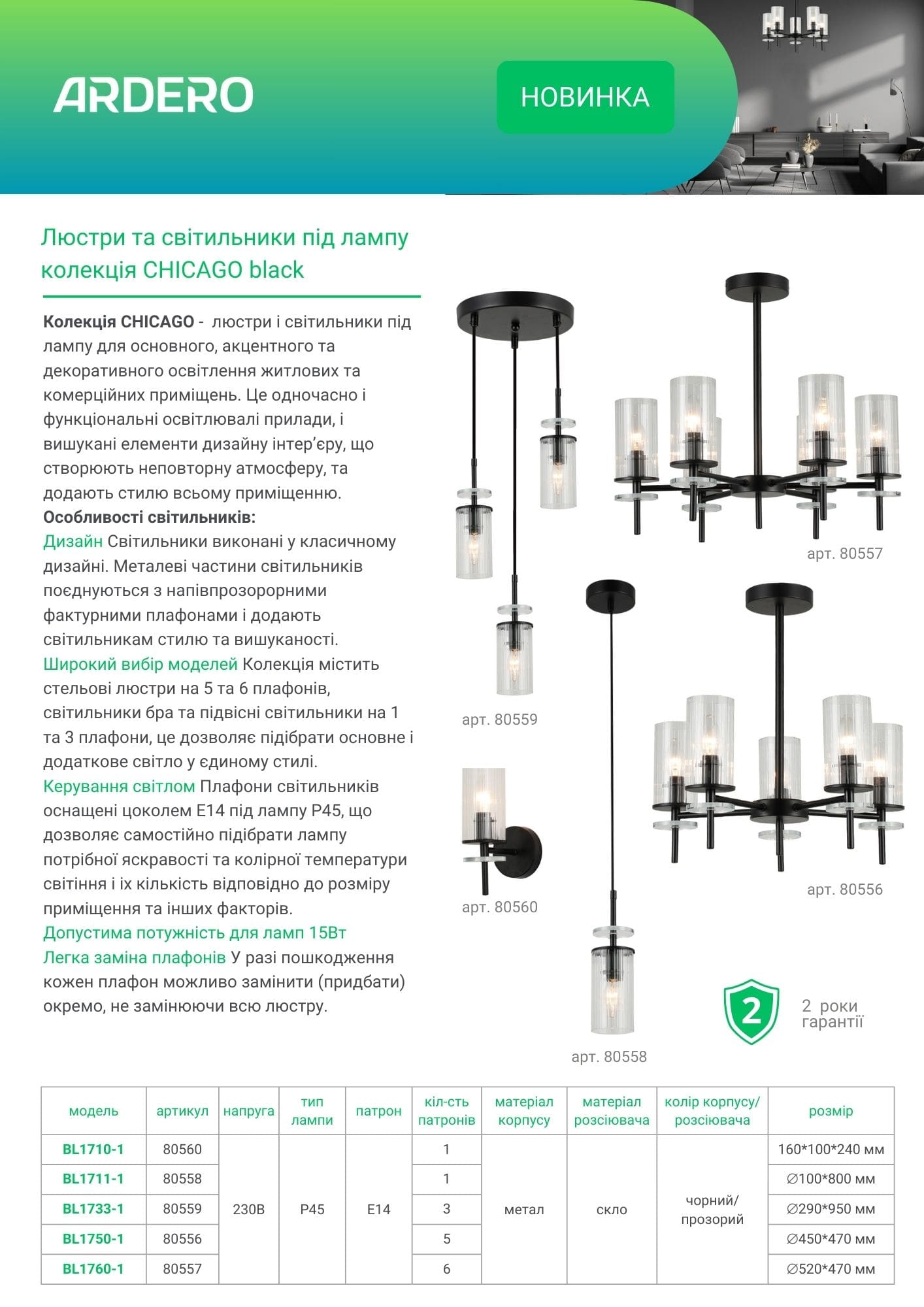 Колекція CHICAGO - люстри й світильники під лампу для основного, акцентного та декоративного освітлення житлових та комерційних приміщень. Це одночасно і функціональні освітлювальні прилади, і вишукані елементи дизайну інтер’єру, що створюють неповторну атмосферу, та додають стилю всьому приміщенню.