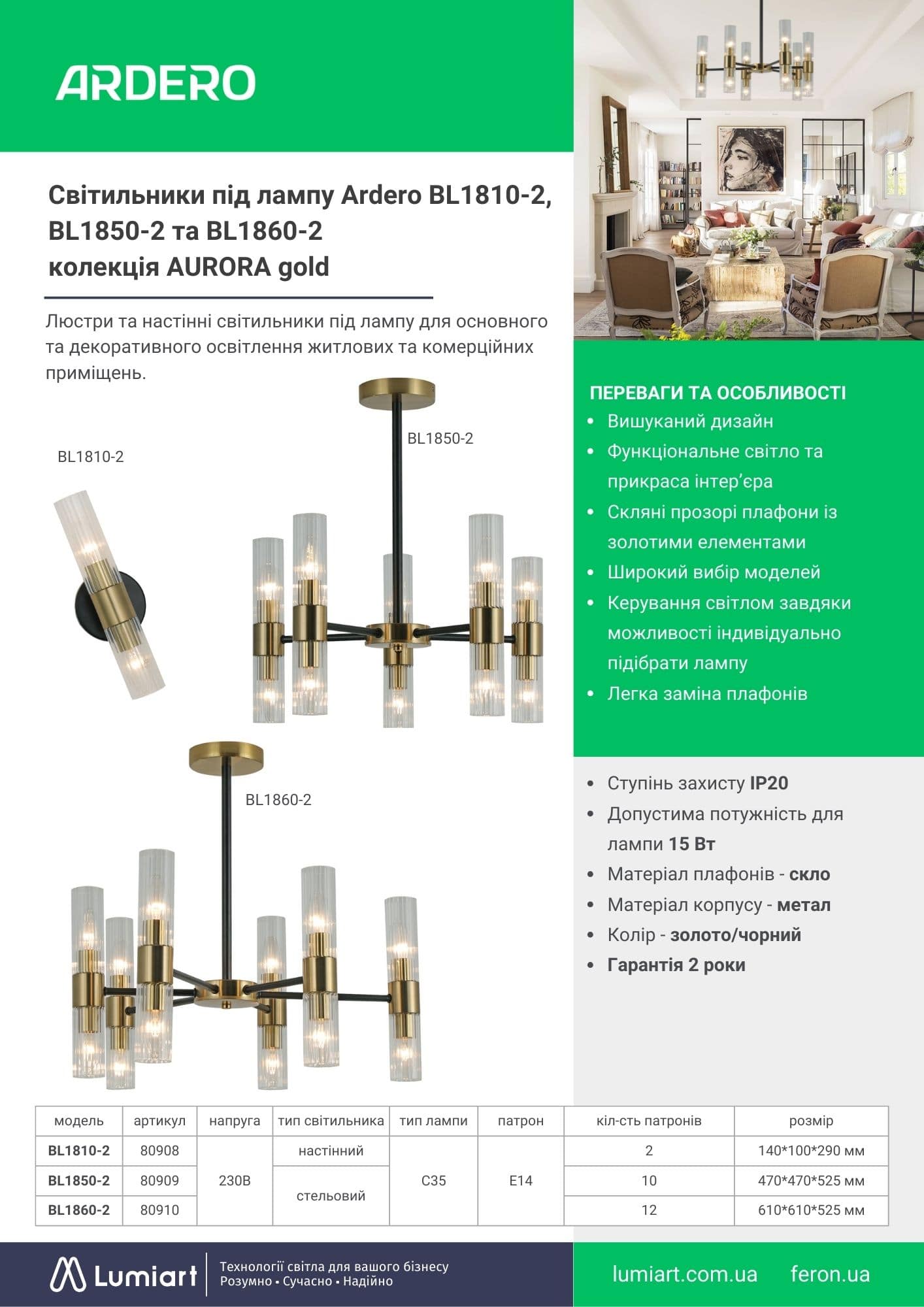 Світильник під лампу Ardero BL1810-2 колекція AURORA gold