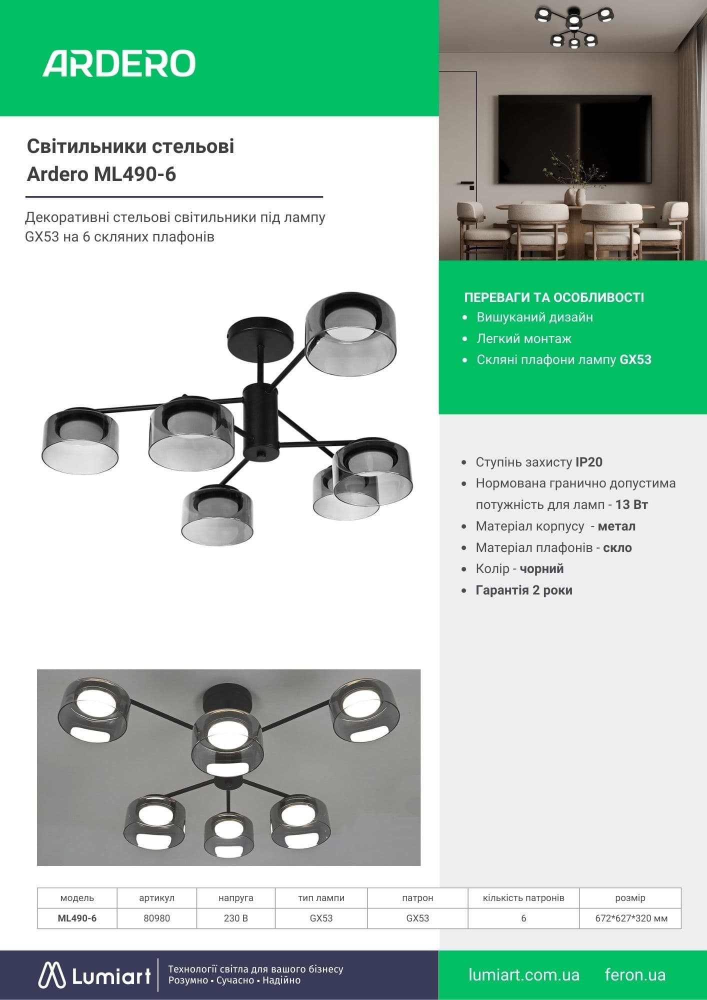 Світлодіодні стельові світильники Ardero ML490-6