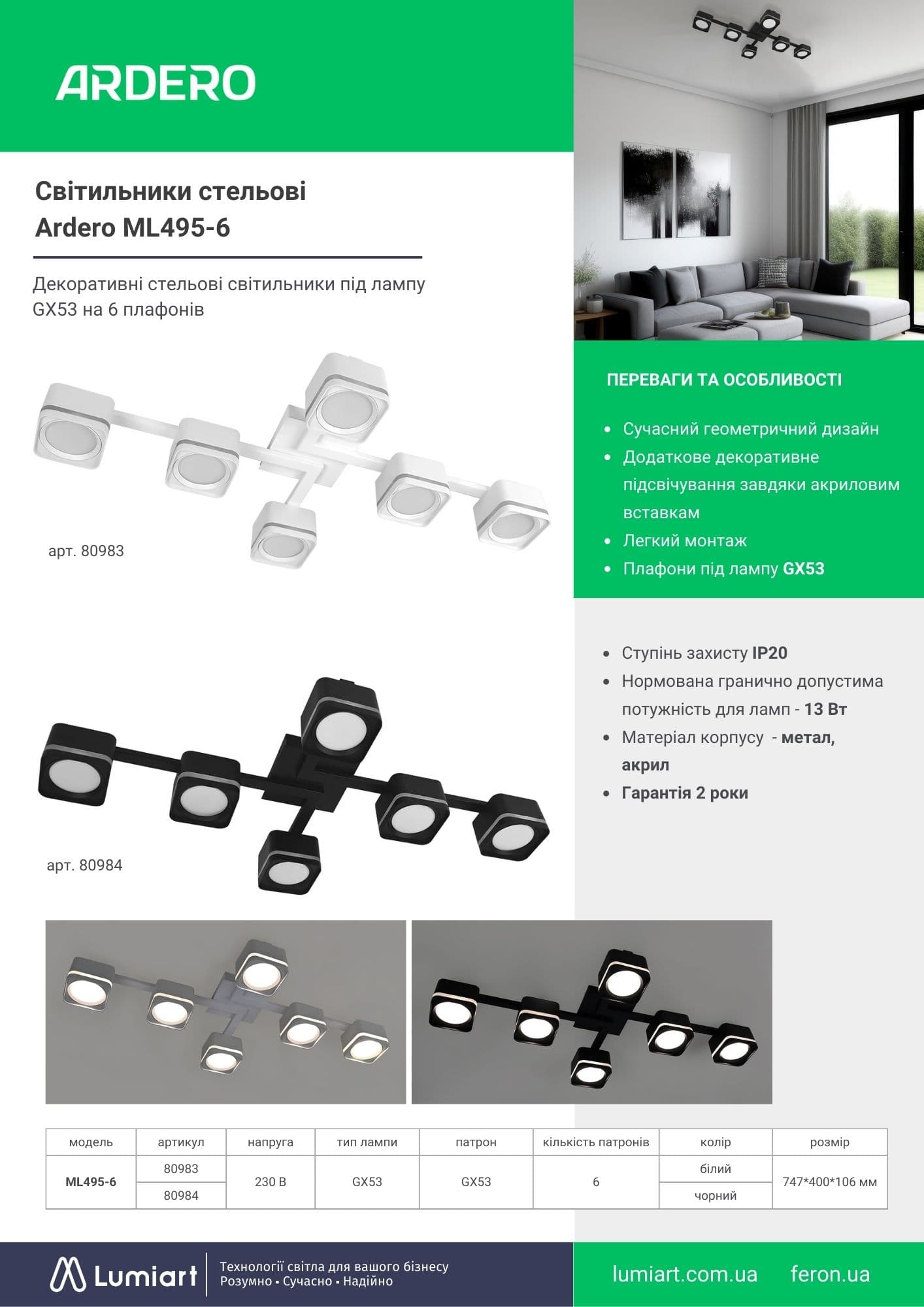 Світлодіодні стельові світильники Ardero ML495-6