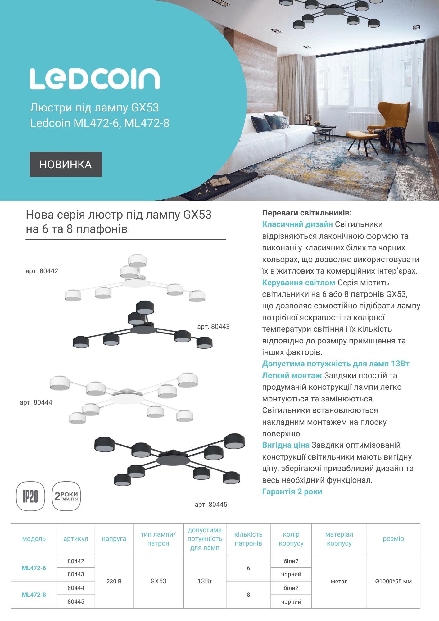 Люстри під лампу GX53 Ledcoin ML472-8