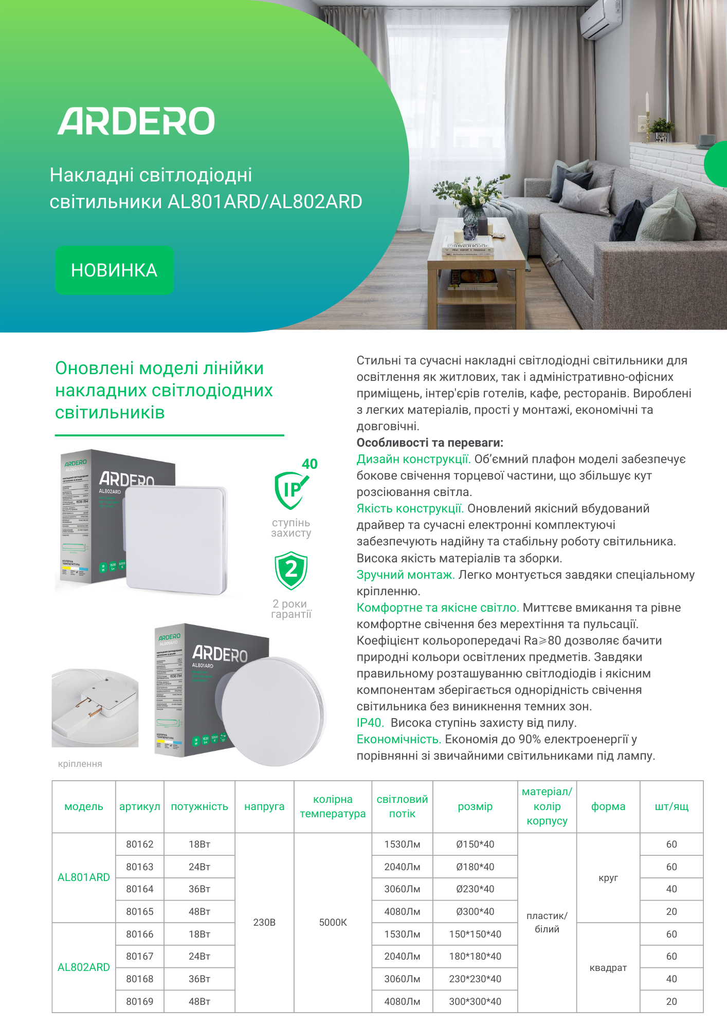 Якість конструкції. Оновлений якісний вбудований драйвер та сучасні електронні комплектуючі забезпечують надійну та стабільну роботу світильника. Висока якість матеріалів та зборки.