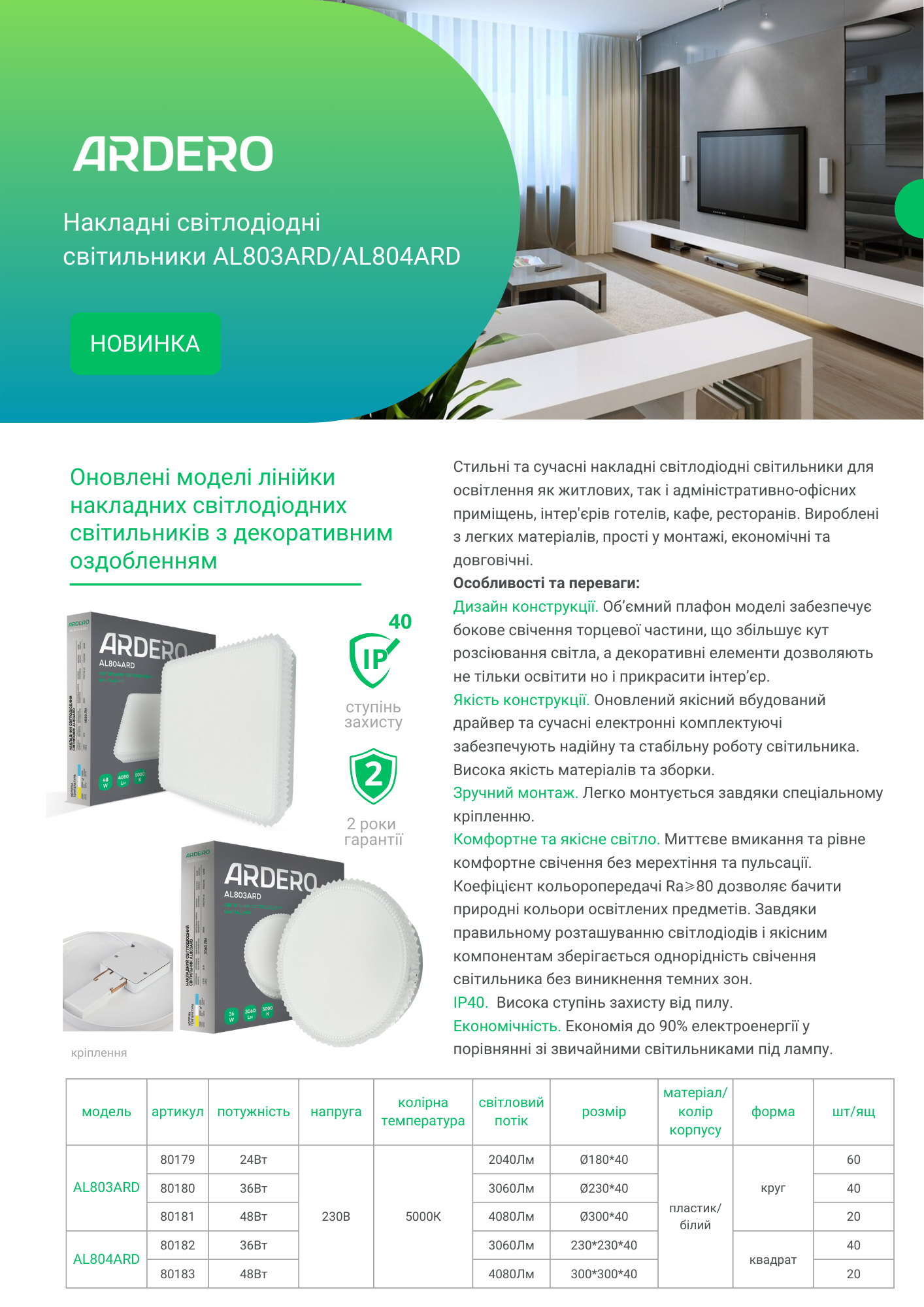 Якість конструкції. Оновлений якісний вбудований драйвер та сучасні електронні комплектуючі забезпечують надійну та стабільну роботу світильника. Висока якість матеріалів та зборки.