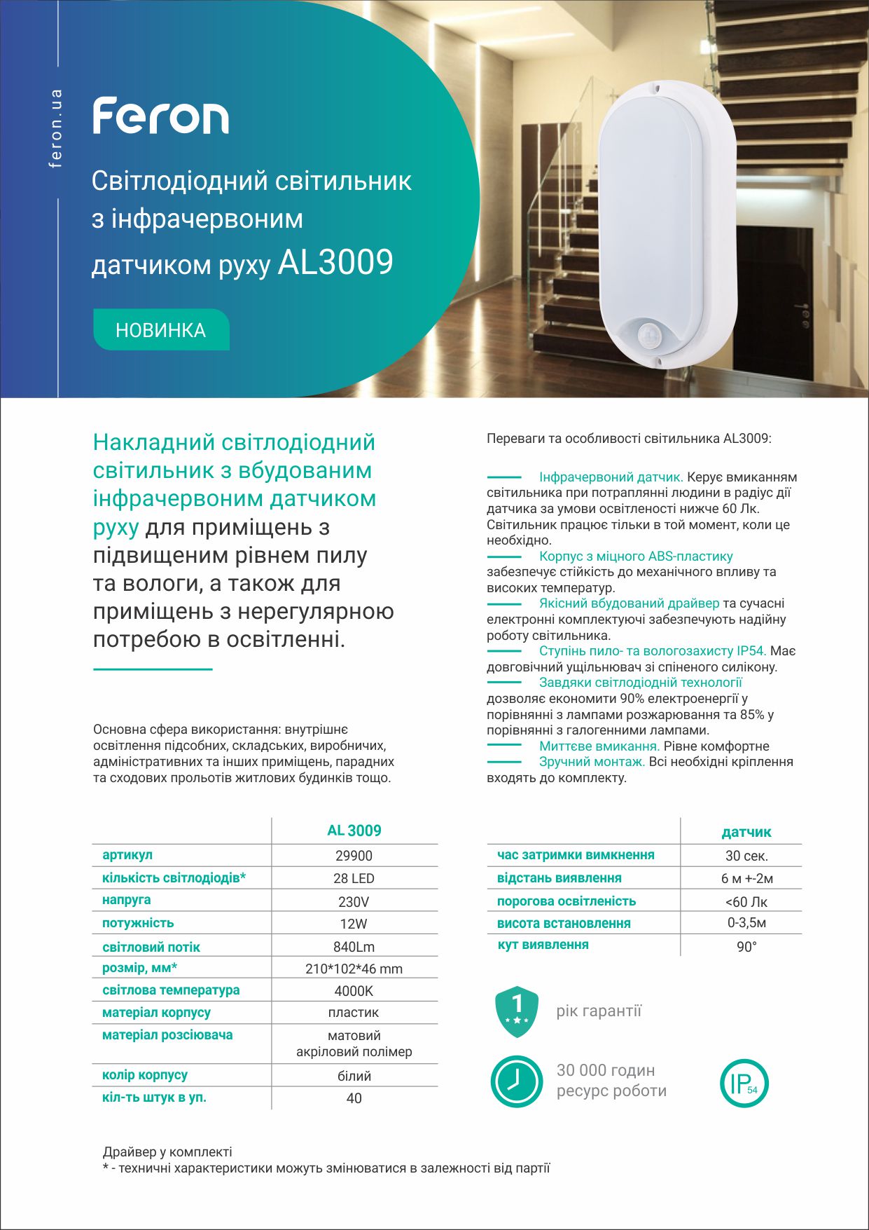 Світлодіодний світильник Feron AL3009 — це ідеальне рішення для тих, хто цінує комфорт, економію та надійність в освітленні.