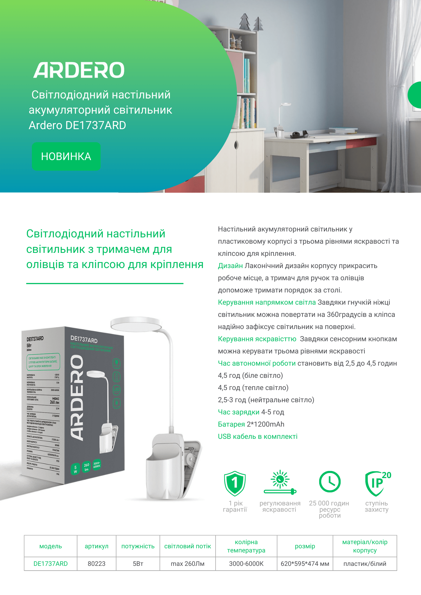 LED настільний світильник з тримачем для олівців та кліпсою для кріплення