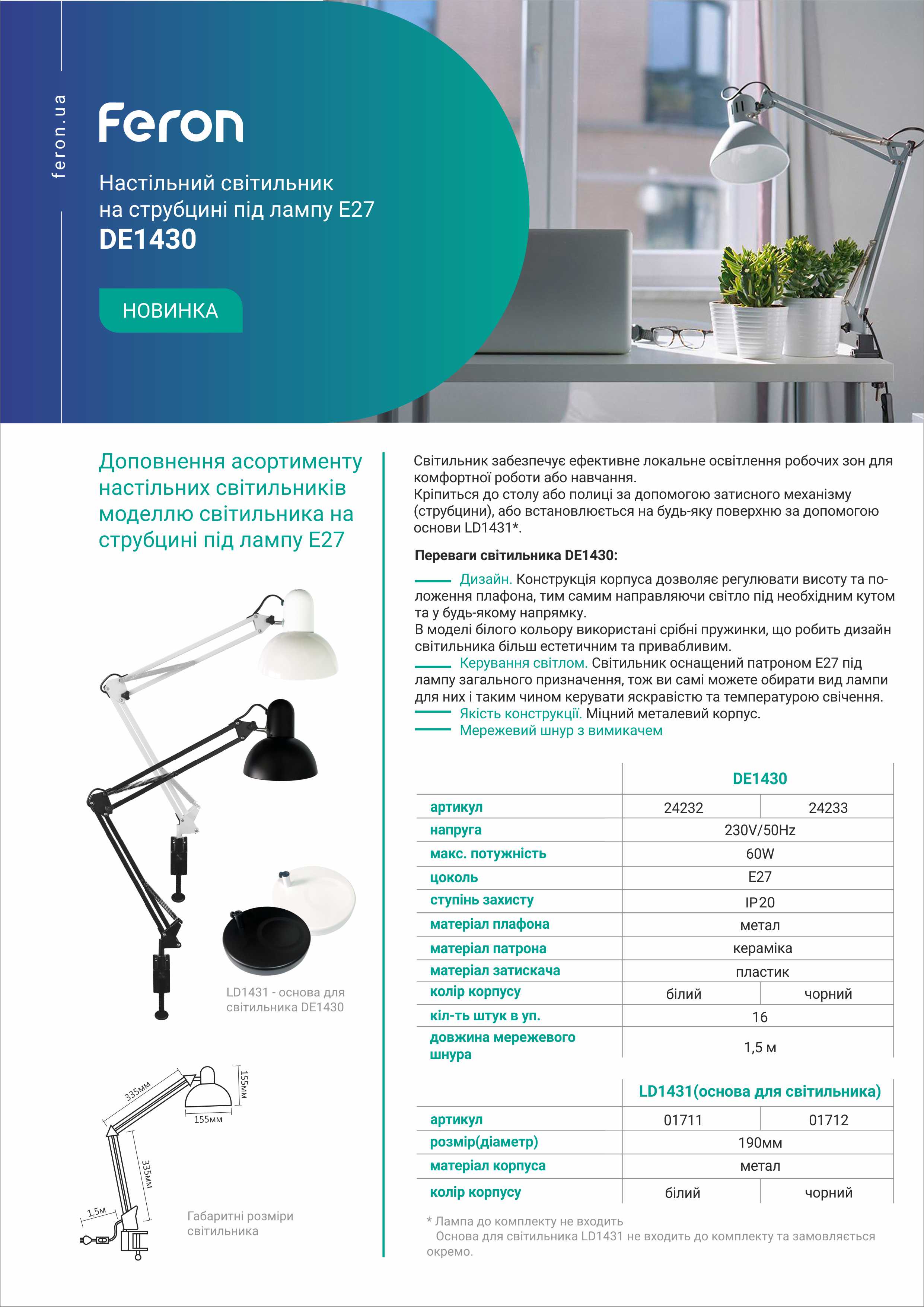 на спеціальну основу LD1431, яка не входить до комплекту. Завдяки цьому світильник можна або зафіксувати