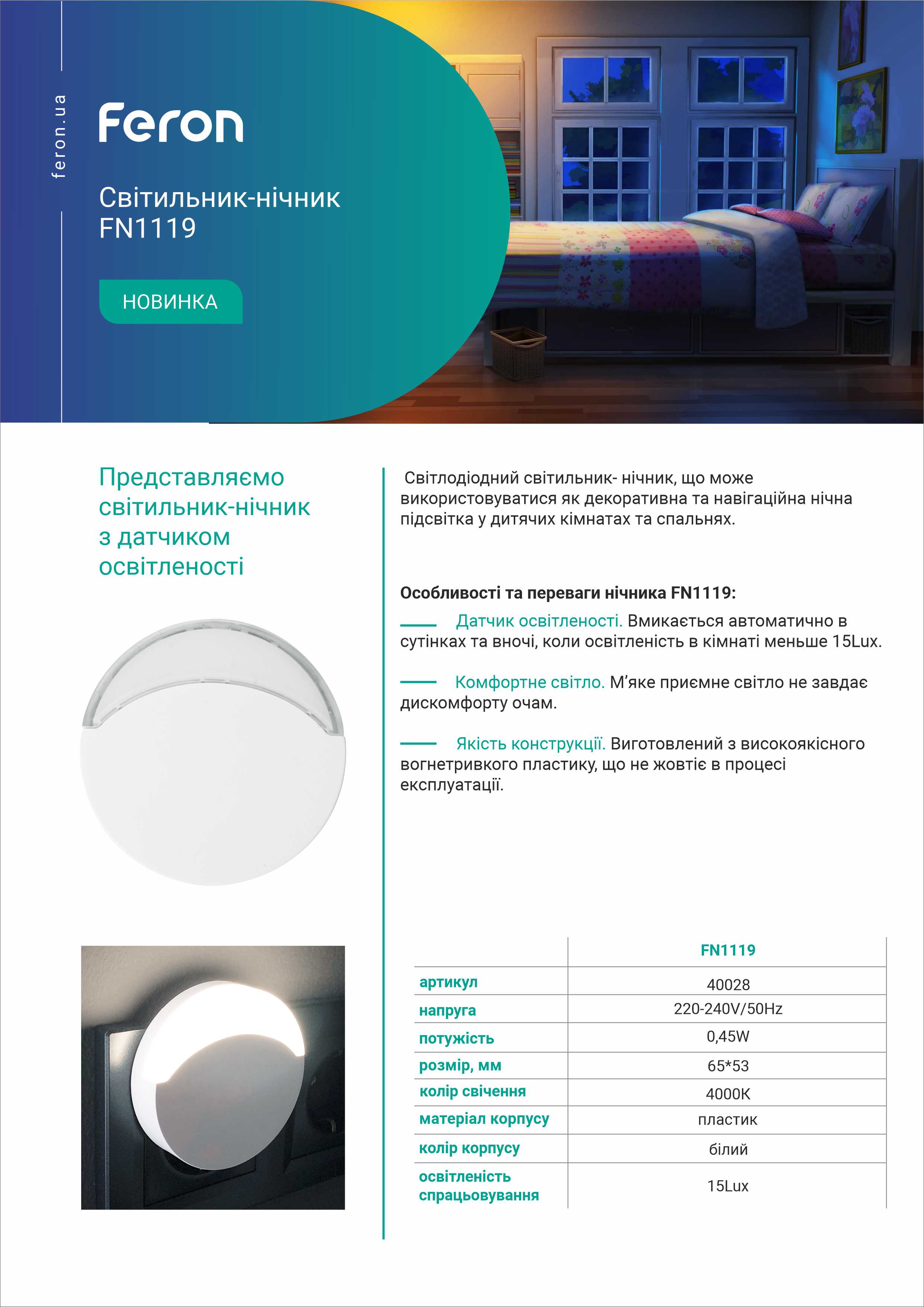 Світильник-нічник з датчиком освітленності. Світлодіодний світильник-нічник, що використовуватися як декоративна нічна підсвітка у дитячих кімнатах та спальнях. Вмикається автоматично в сутінках та вночі, коли освітленість в кімнатах меньше 15Lux. Світильник виготовлений з високоякісного вогнетривкого пластику, що не жовтіє в процесі експлуатації.