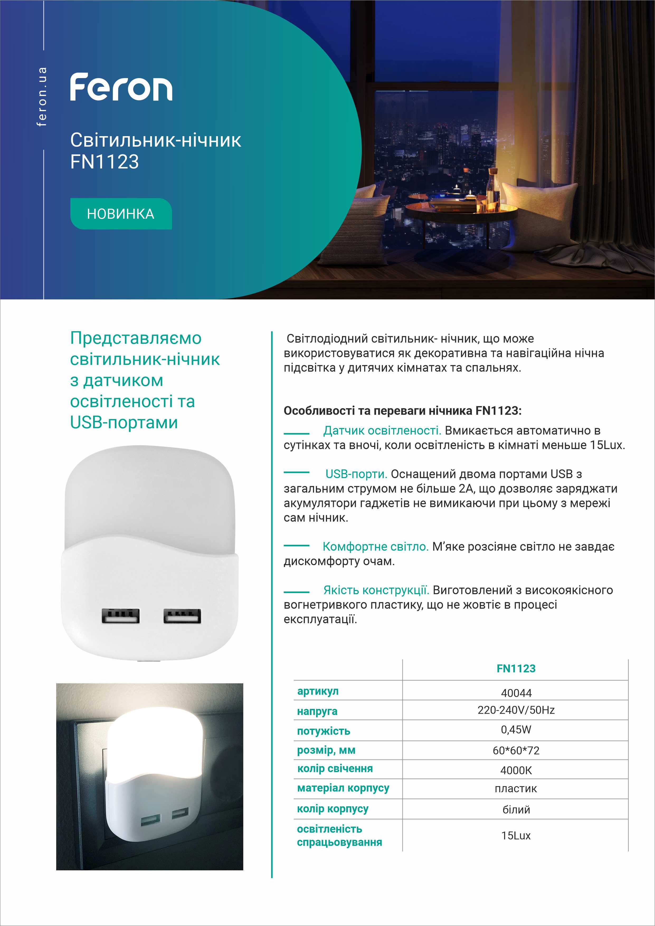 Світильник-нічник з датчиком освітленності та USB-портами. Світлодіодний світильник-нічник, що використовуватися як декоративна нічна підсвітка у дитячих кімнатах та спальнях. Вмикається автоматично в сутінках та вночі, коли освітленість в кімнатах меньше 15Lux. Також світильник оснащений двома портами USB, що дозволяє заряджати акумулятори гаджетів не вимикаючи при цьому з мережі сам нічник. Світильник виготовлений з високоякісного вогнетривкого пластику, що не жовтіє в процесі експлуатації.