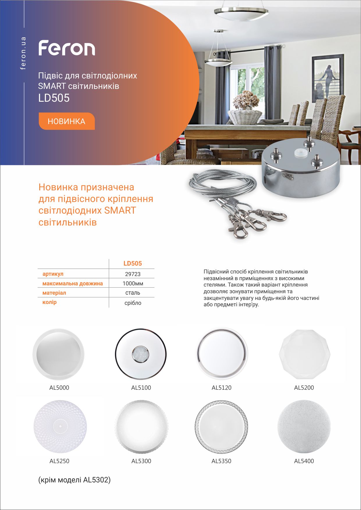 Підвіс Feron LD505 — це ідеальне рішення для тих, хто хоче додати стильний та функціональний елемент до свого освітлення.