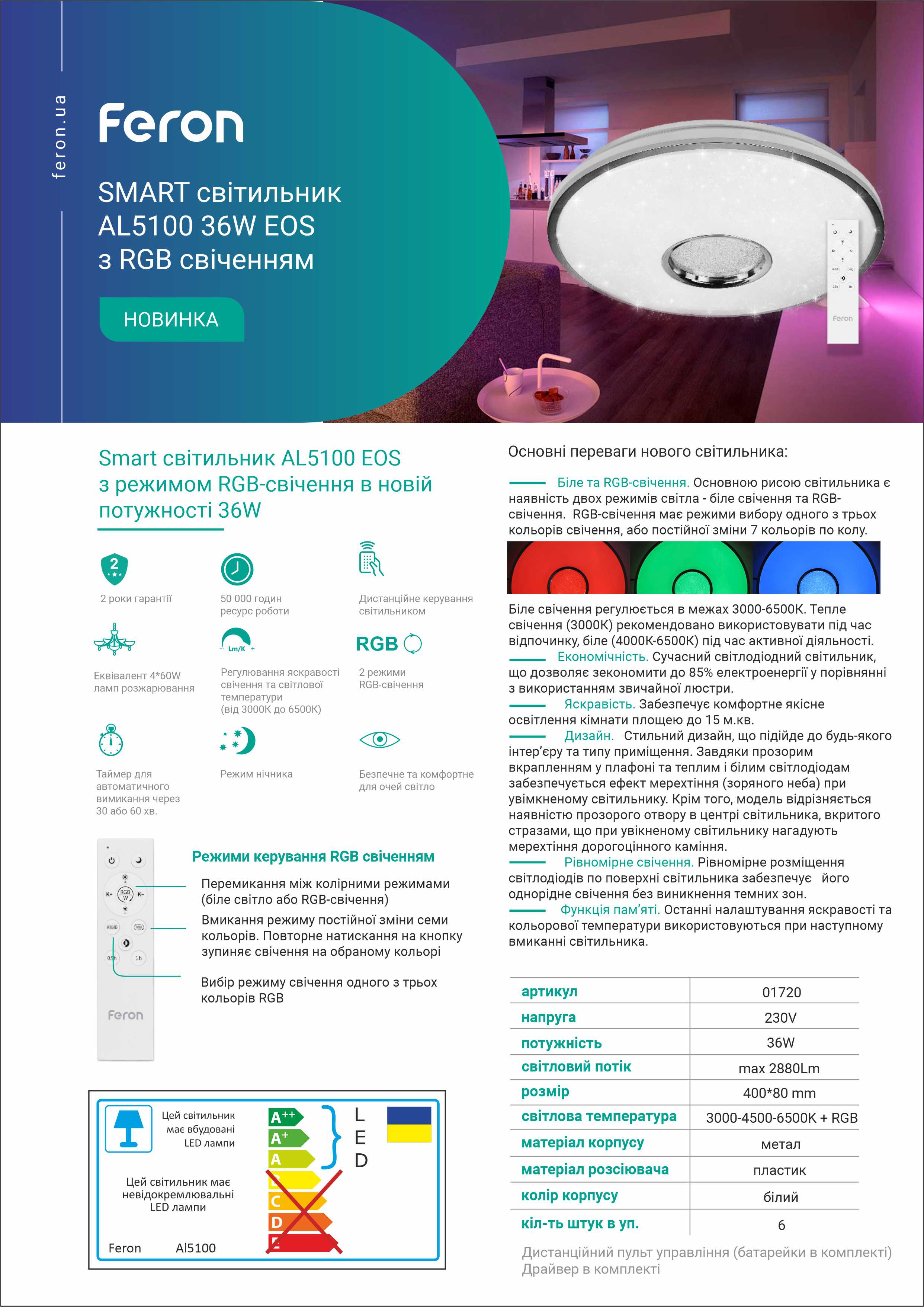 | Корельована колірна температура, K | 3000-6500 |