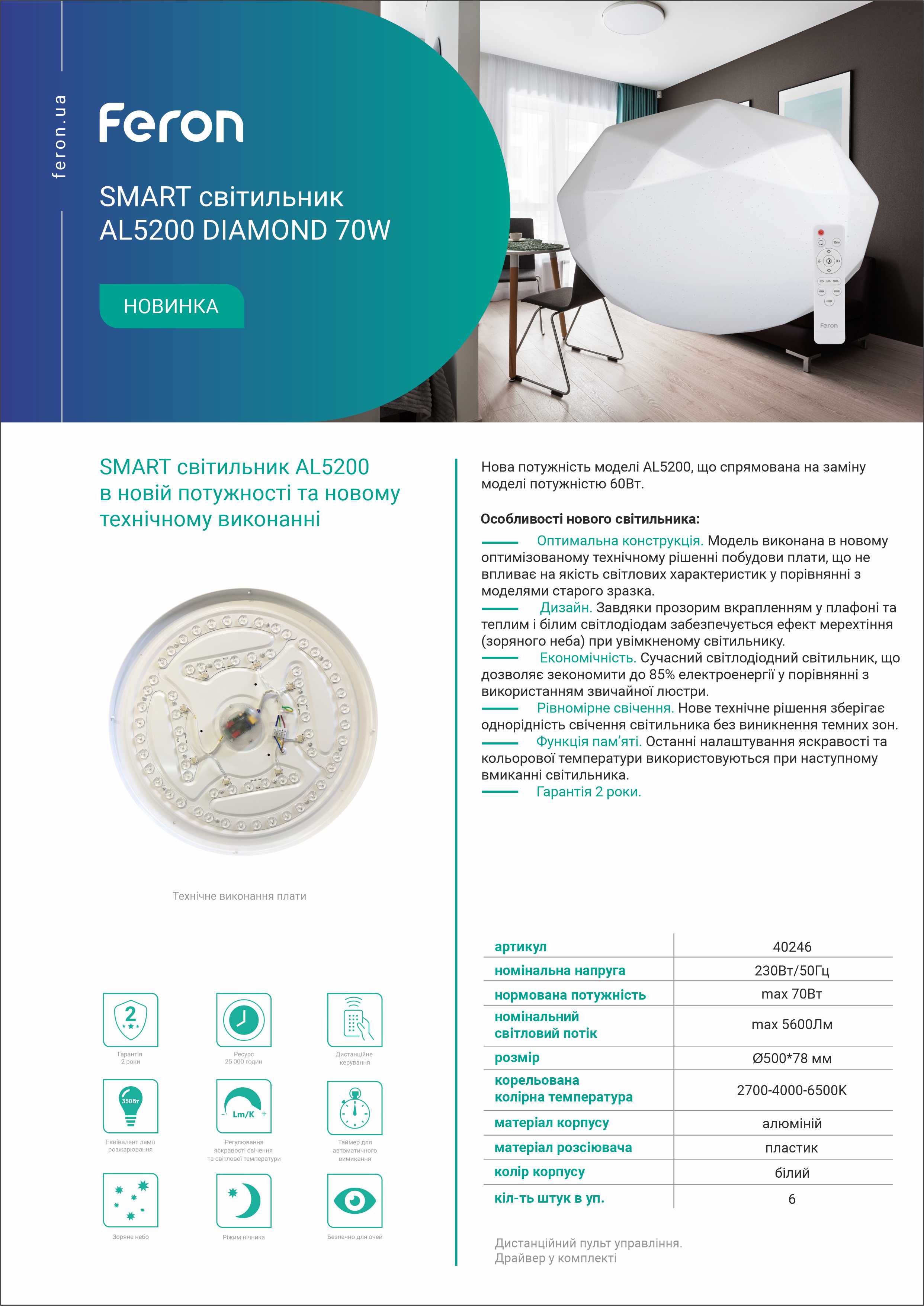 SMART світильник AL5200 в новому оптимізованому технічному рішенні побудови плати, що не впливає на якість світлових характеристик у порівнянні з моделями старого зразка.