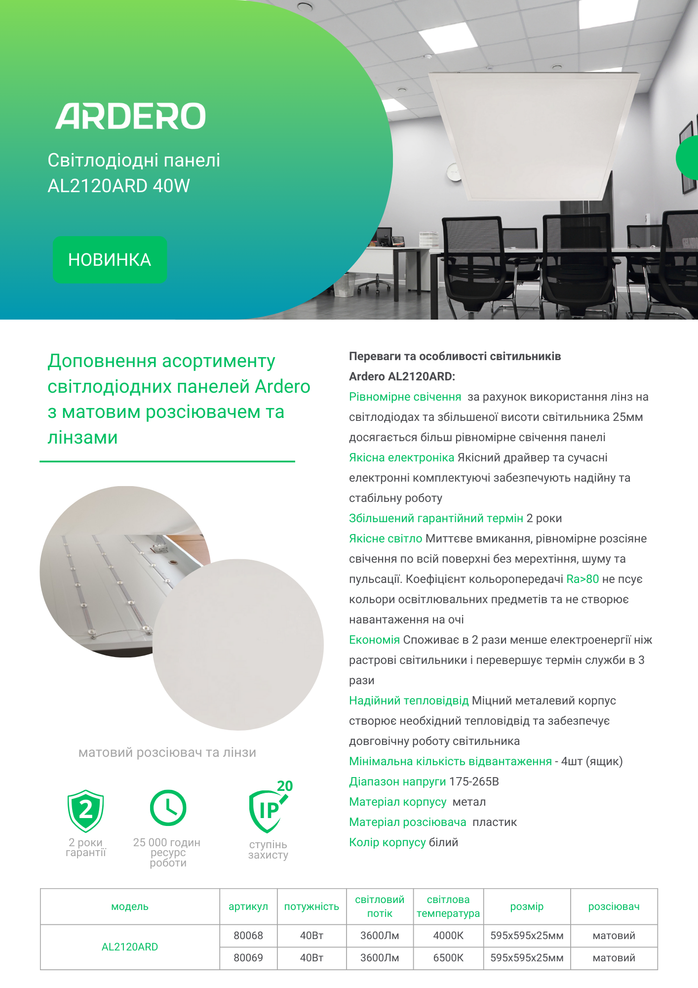 Монтаж та підключення світлодіодної панелі Ardero дуже прості, оскільки всі необхідні елементи постачаються у комплекті. Це сучасний надійний продукт високої якості, ідеальний для освітлення адміністративних, офісних, торговельних та громадських приміщень.