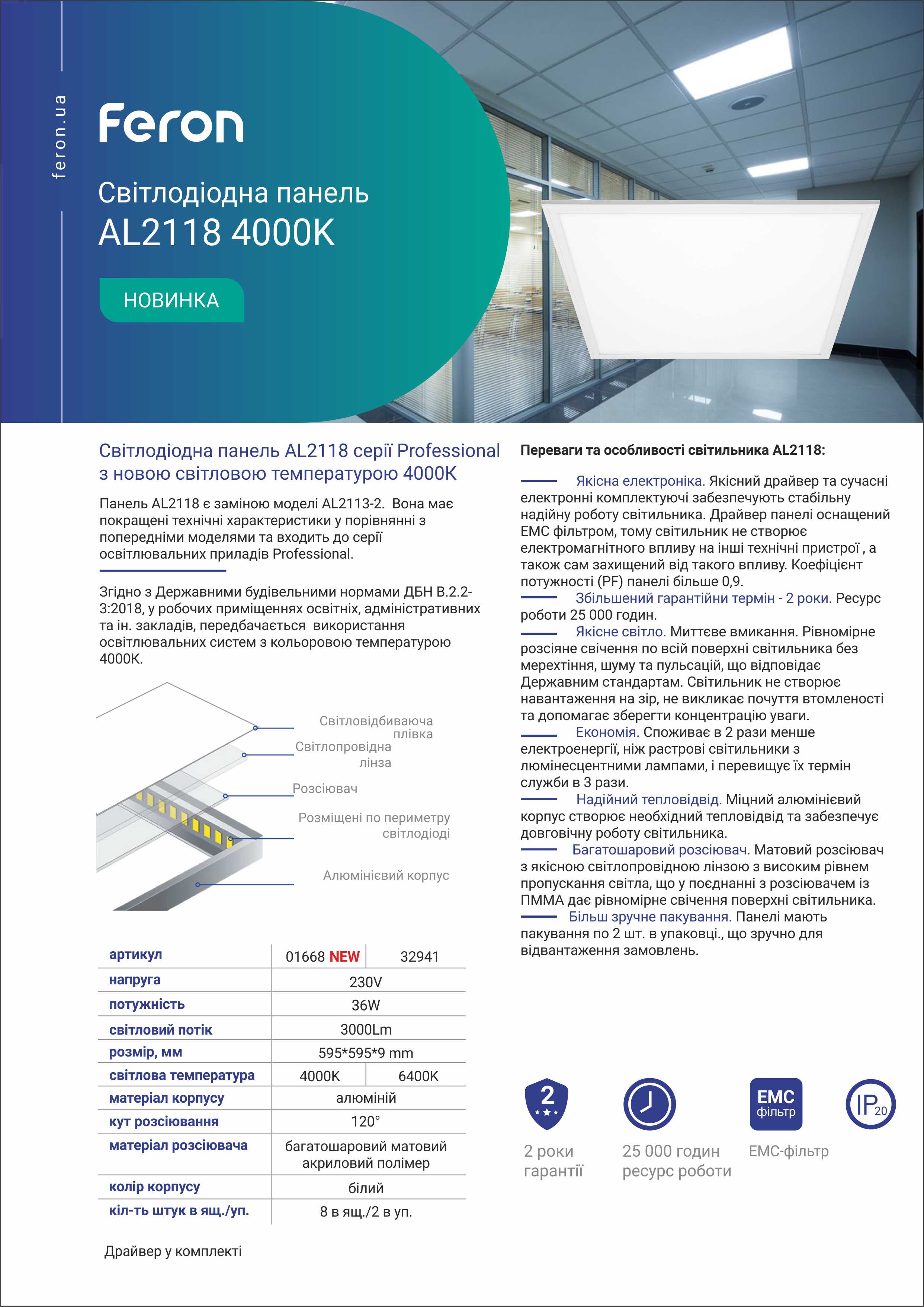 Світлодіодна панель Feron є аналогом вбудованого чи накладного люмінесцентного світильника типу 4хТ8. Використання світлодіодної панелі дозволяє загалом зекономити більше 30% електроенергії, у порівнянні з використанням типових застарілих світильників. Мають значний ресурс роботи, завдяки використанню передових технологій виробництва та сучасних матеріалів і комплектуючих. Це екологічний світильник - в ньому відсутні інфрачервоні на УФ випроміннювання. Світильник вмикається миттєво та забезпечує рівномірне, яскраве, стабільне свічення без мерехтіння та бліків. Це свторює комфортні умови як для роботи, так і відпочинку. Світильник дуже простий у підключенні та монтажі - всі необхідні для установки елементи постачаються у комплекті. Таким чином світлодіодна панель TM Feron - це сучасний надійний продукт високої якості для освітлення адміністративно-офісних, торговельних, громадських та ін. приміщень.