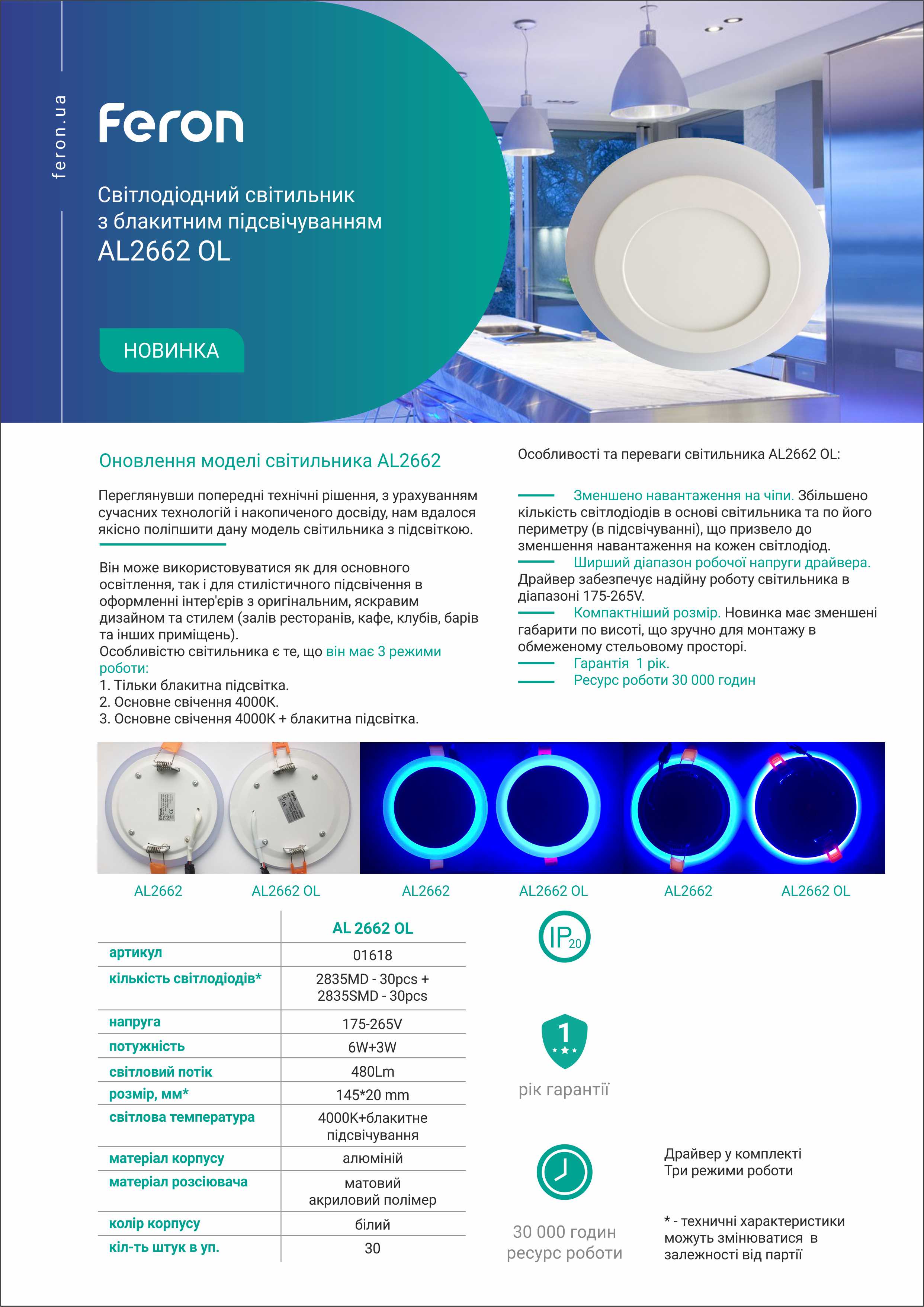 Світлодіодний світильник Feron є аналогом світильників типу downlight. Окрім звичного режима освітлення має режим блакитного підсвічування. Використання світлодіодного світильника дозволяє зекономити 90% електроенергії, у порівнянні зі світильниками у яких використовуються лампи розжарювання та більше 50%, у порівнянні з тими, в яких використвуються енергозберігаючі лампи. Світильник працює в трьох режимах: основне свічення, блакитна підсвітка, основне свічення + блакитна підсвітка. Мають значний ресурс роботи, завдяки використанню передових технологій виробництва та сучасних матеріалів і комплектуючих. Це екологічний світильник - в ньому відсутні інфрачервоні на УФ випроміннювання. Світильник вмикається миттєво та забезпечує рівномірне, яскраве, стабільне свічення без мерехтіння та бліків. Це свторює комфортні умови як для роботи, так і відпочинку. Світильник дуже простий в підключенні та монтажі. Світлодіодні світильники TM Feron - це сучасний надійний продукт високої якості для освітлення житлових приміщень, розважальних закладів та ін.
