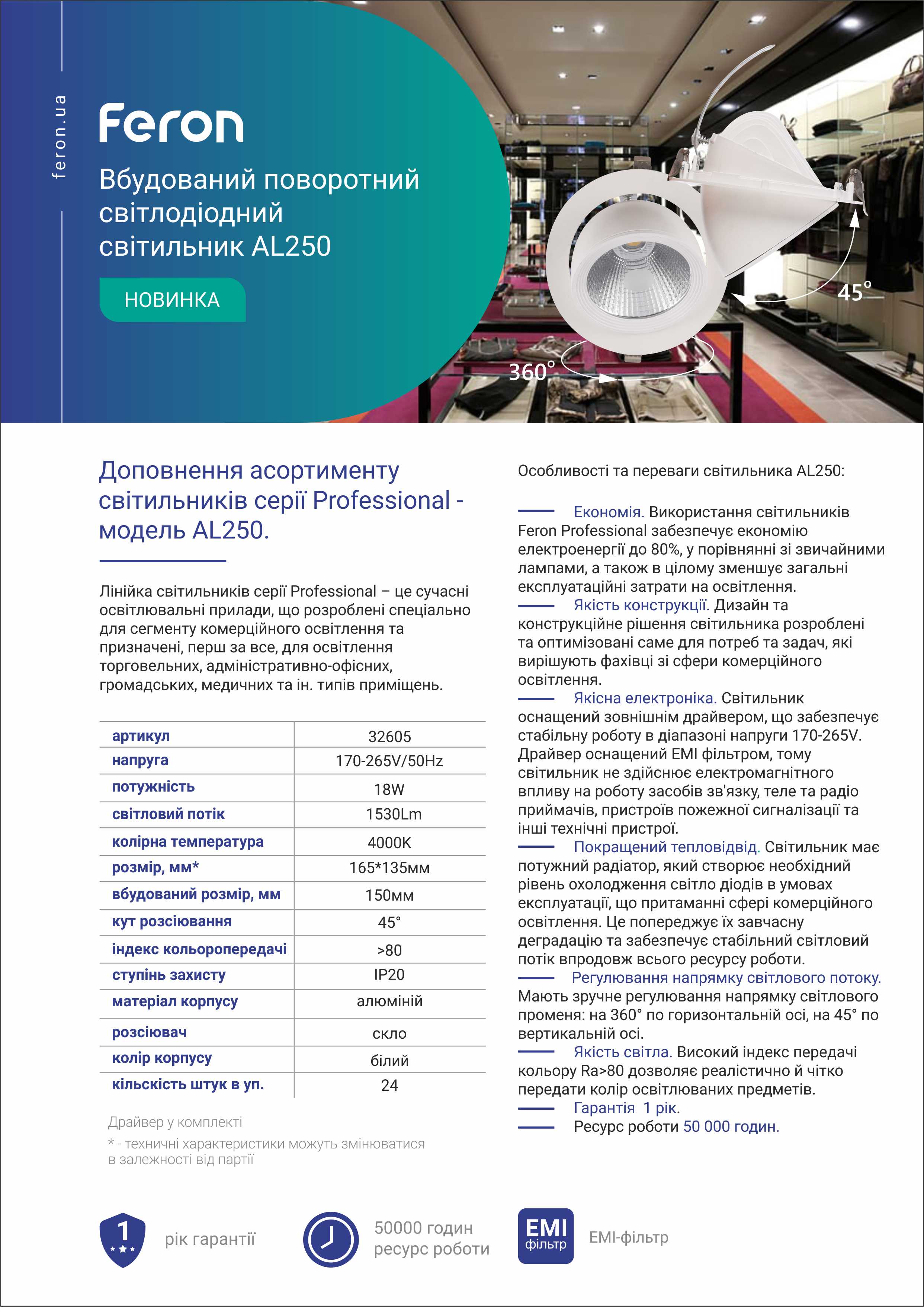 Використання світильника Feron Professional забезпечує економію електроенергії до 80% у порівнянні зі звичайними лампами. Він оснащений вбудованим драйвером, що забезпечує стабільну роботу в діапазоні напруги 170-265V.