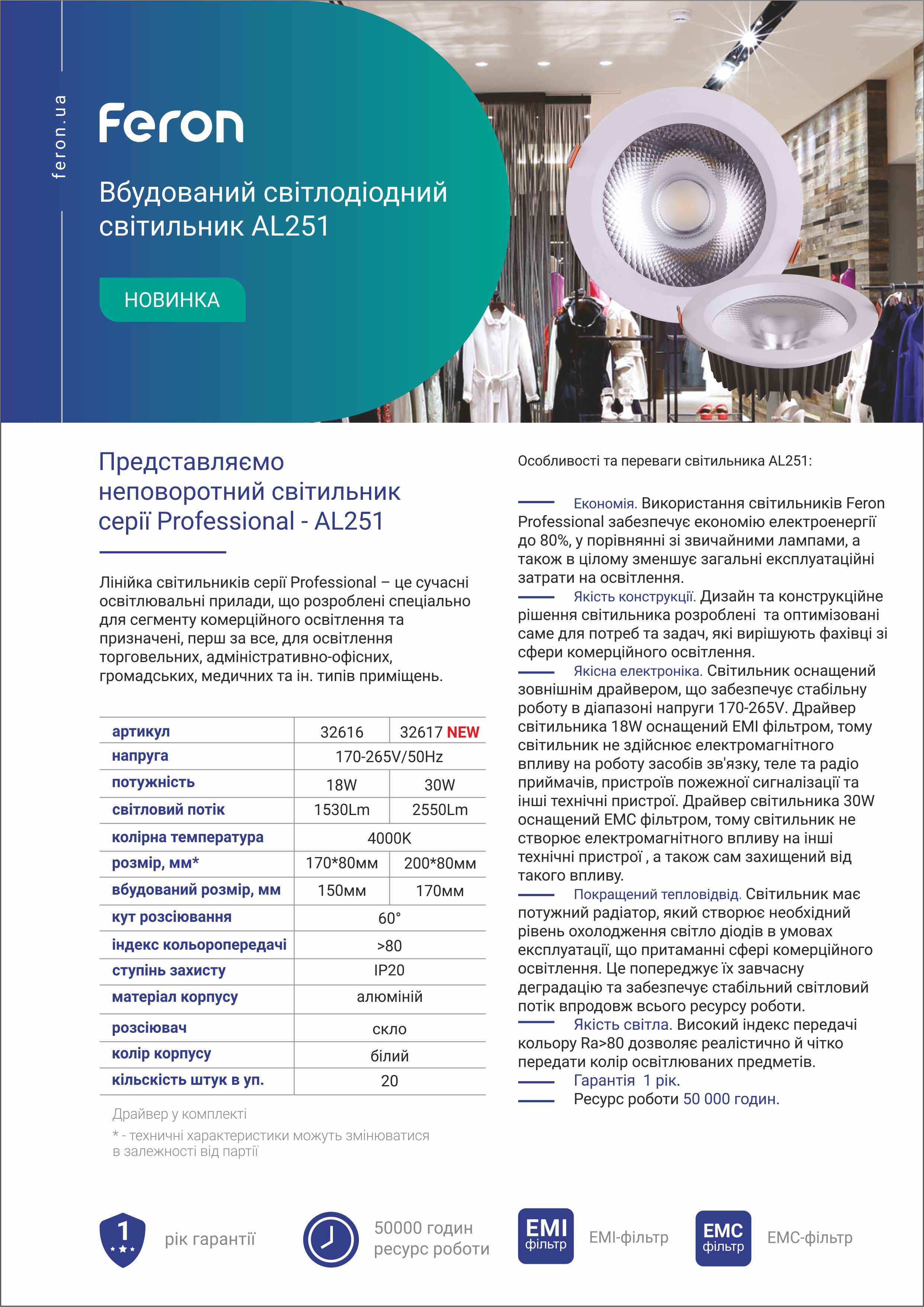 Лінійка світильників серії Professional - це сучасні освітлювальні прилади, що розроблені спеціально для сегменту комерційного освітлення та призначені, перш за все, для освітлення торгівельних, адміністративно-офісних, громадських, медичних та ін. типів приміщень. Дизайн та конструкційне рішення світильника розроблені та оптимізовані саме для потреб та задач, які вирішують фахівці зі сфери комерційного освітлення. Використання світильника Feron Professional забезпечує економію електроенергії до 80%, у порівнянні зі звичайними лампами. Світильник оснащений вбудованим драйвером, що забезпечує стабільну роботу в діапазоні напруги 170-265V. Світильник має потужний радіатор, який створює необхідний рівень охолодження світлодіодів в умовах експлуатації, що притаманні сфері комерційного освітлення. Це попереджує їх завчасну деградацію та забезпечує стабіліний світловий потік впродовж всьго ресурсу роботи.Ресурс таких світильникив складає 50 000 годин.