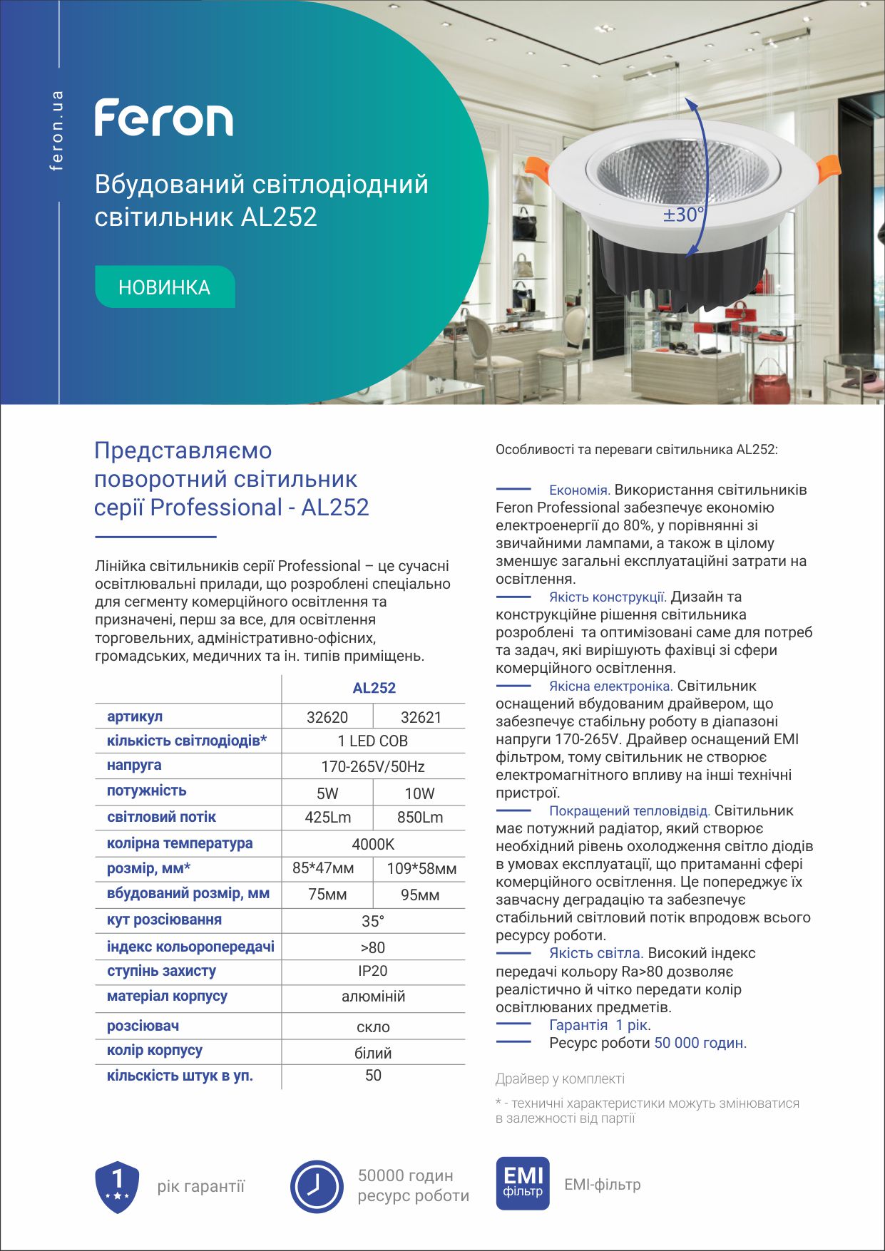 Лінійка світильників серії Professional - це сучасні освітлювальні прилади, що розроблені спеціально для сегменту комерційного освітлення та призначені, перш за все, для освітлення торгівельних, адміністративно-офісних, громадських, медичних та ін. типів приміщень. Дизайн та конструкційне рішення світильника розроблені та оптимізовані саме для потреб та задач, які вирішують фахівці зі сфери комерційного освітлення. Використання світильника Feron Professional забезпечує економію електроенергії до 80%, у порівнянні зі звичайними лампами. Світильник оснащений вбудованим драйвером, що забезпечує стабільну роботу в діапазоні напруги 170-265V. Світильник має потужний радіатор, який створює необхідний рівень охолодження світлодіодів в умовах експлуатації, що притаманні сфері комерційного освітлення. Це попереджує їх завчасну деградацію та забезпечує стабіліний світловий потік впродовж всьго ресурсу роботи.Ресурс таких світильникив складає 50 000 годин.