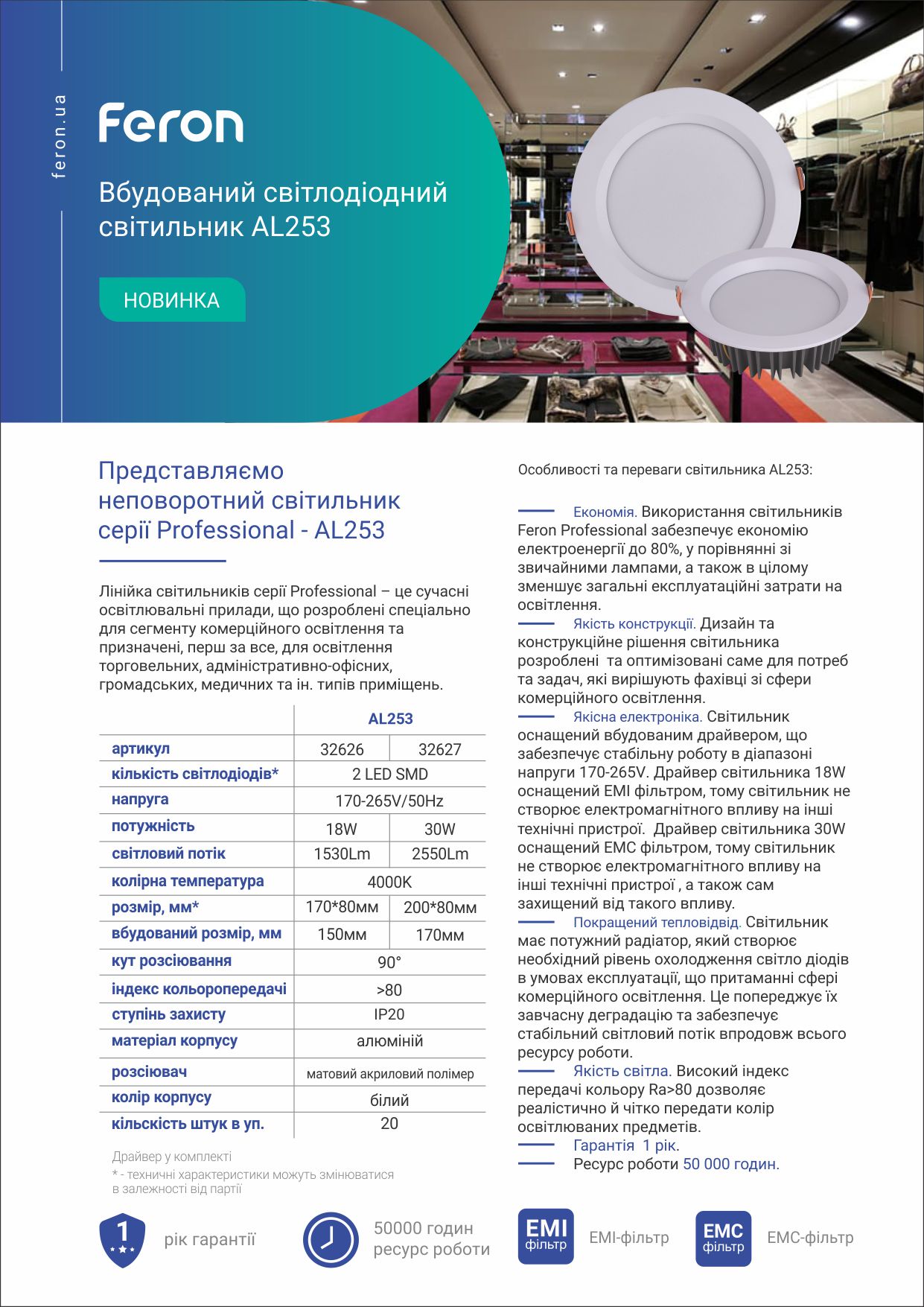 Лінійка світильників серії Professional - це сучасні освітлювальні прилади, що розроблені спеціально для сегменту комерційного освітлення та призначені, перш за все, для освітлення торгівельних, адміністративно-офісних, громадських, медичних та ін. типів приміщень. Дизайн та конструкційне рішення світильника розроблені та оптимізовані саме для потреб та задач, які вирішують фахівці зі сфери комерційного освітлення. Використання світильника Feron Professional забезпечує економію електроенергії до 80%, у порівнянні зі звичайними лампами. Світильник оснащений вбудованим драйвером, що забезпечує стабільну роботу в діапазоні напруги 170-265V. Світильник має потужний радіатор, який створює необхідний рівень охолодження світлодіодів в умовах експлуатації, що притаманні сфері комерційного освітлення. Це попереджує їх завчасну деградацію та забезпечує стабіліний світловий потік впродовж всьго ресурсу роботи.Ресурс таких світильникив складає 50 000 годин.