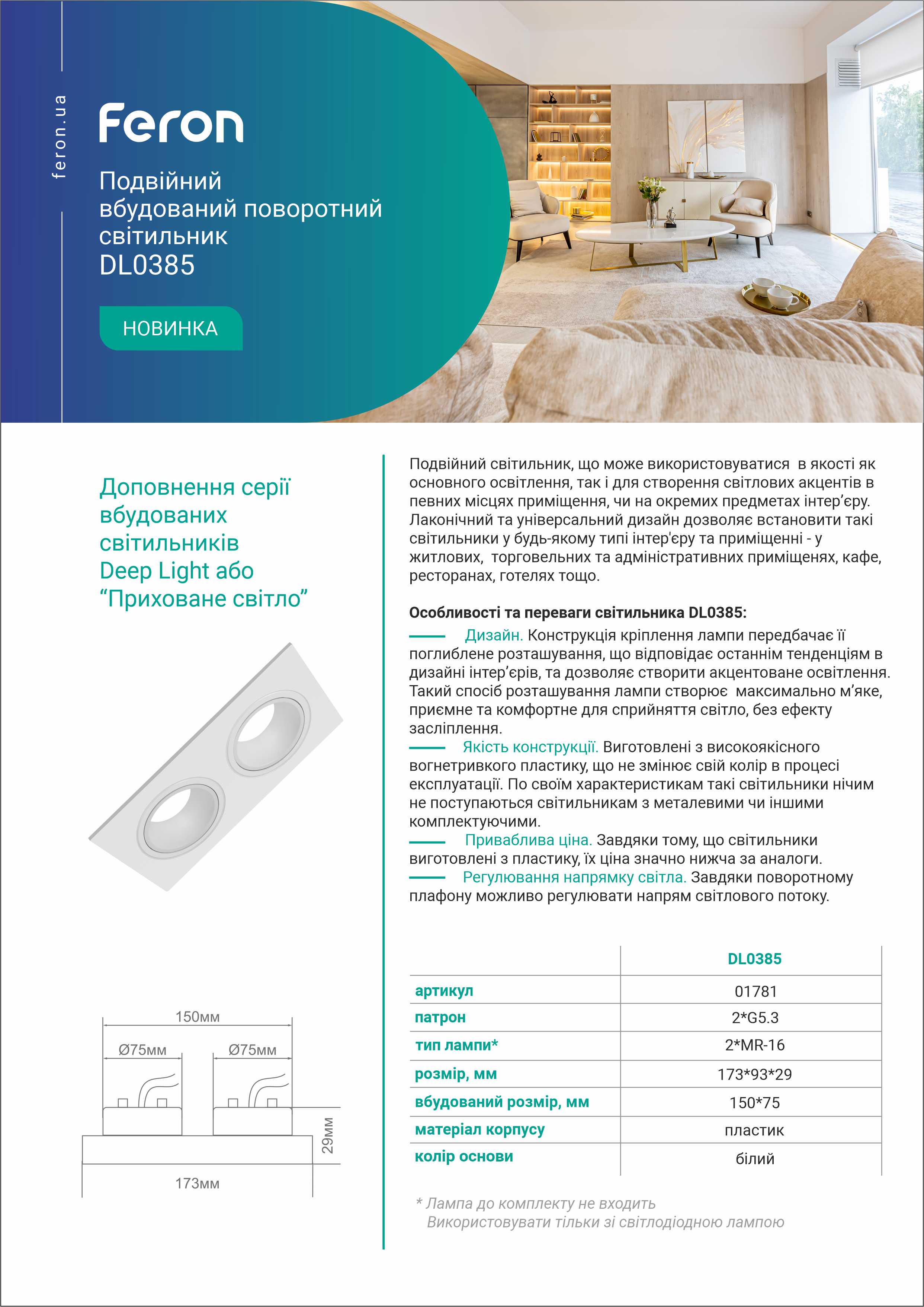 Світильник DL0385 може використовуватися в якості як основного освітлення, так і для світлових акцентів в певних ділянках приміщення, чи на окремих предметах інтер'єру. Лаконічний та універсальний дизайн дозволяє встановити такі світильники у будь-якому типі інтер'єру та приміщенні - у житлових, торгівельних та адміністративних приміщенях, кафе, ресторанах, готелях тощо. Конструкція кріплення лампи передбачає її поглиблене розташування, що відповідає останнім тенденціям в дизайні інтер'єрів, та дозволяє створити акцентоване освітлення. Такий спосіб розташування лампи створює максимально м'яке, приємне та комфортне для сприйняття світла, без ефекту засліплення. Светильник виготовленний з високоякісного термостійкого пластику, що не жовтіє в процесі експлуатації. По своїм характеристикам такі світильник нічим не поступаються світильникам з металевими чи іншими комплектуючими. Завдяки поворотному плафону можливо регулювати напрям світлового потоку.