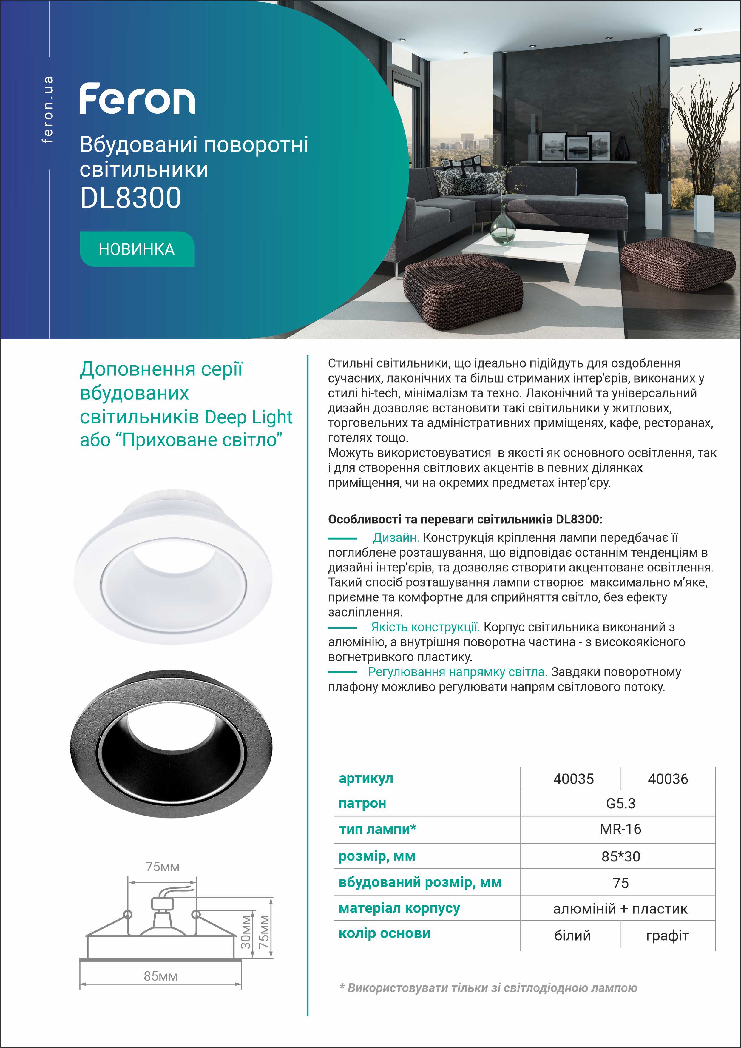 Стильний світильник, що ідеально підійде для оздоблення сучасних, лаконічних та більш стриманих інтер'єрів, виконаних у стилі hi-tech, минималізм та техно. Лаконічний та універсальний дизайн дозволяє встановити такі світильники у будь-якому типі інтер'єру та приміщенні - у житлових, торгівельних та адміністративних приміщенях, кафе, ресторанах, готелях тощо. Конструкція кріплення лампи передбачає її поглиблене розташування, що відповідає останнім тенденціям в дизайні інтер'єрів, та дозволяє створити акцентоване освітлення. Такий спосіб розташування лампи створює максимально м'яке, приємне та комфортне для сприйняття світла, без ефекту засліплення. Світильник виготовлений з алюмінію, а внутрішня поворотна частина - з високоякісного термостійкого пластику. Завдяки поворотному плафону можливо регулювати напрям світлового потоку.
