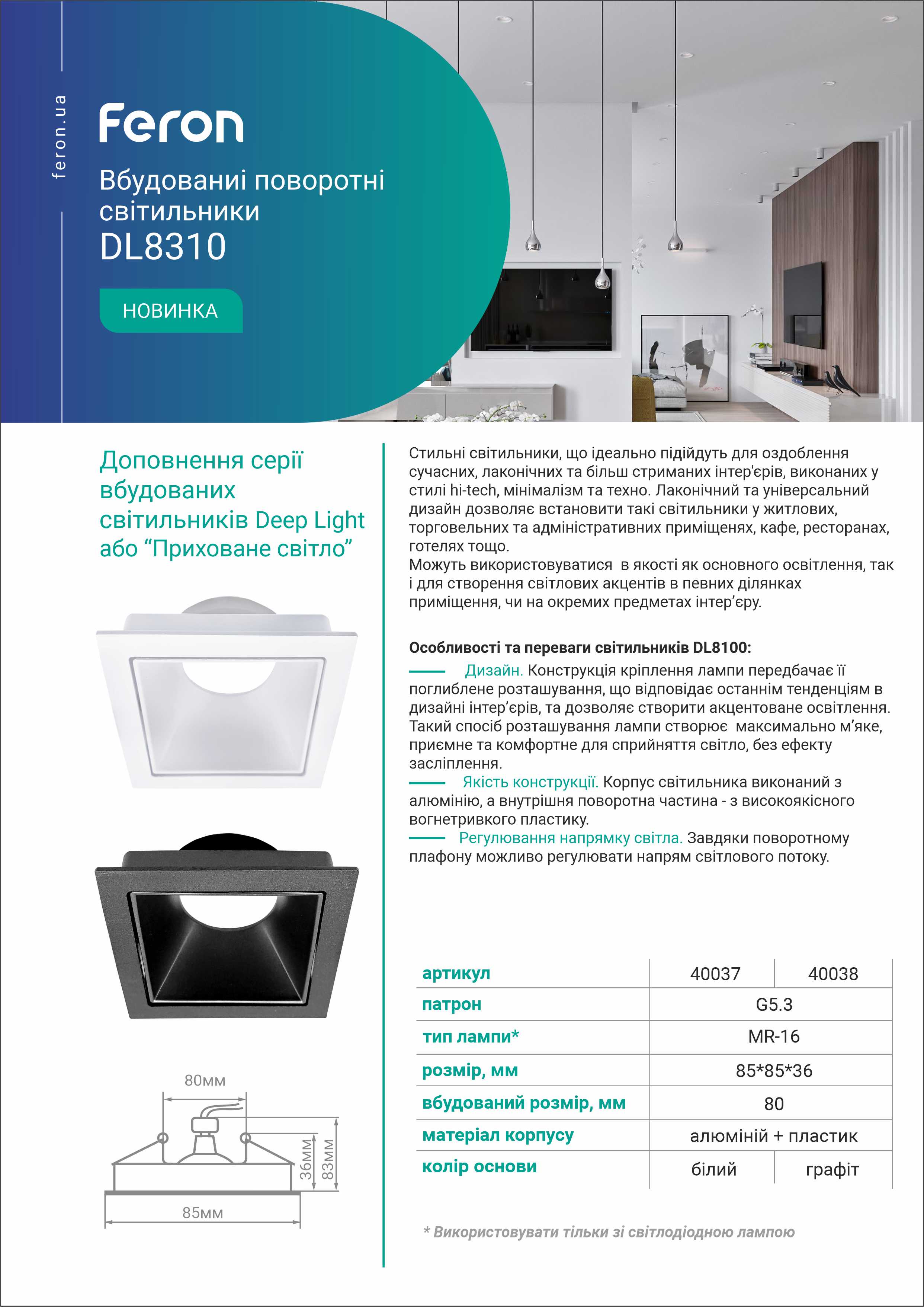 Стильний світильник, що ідеально підійде для оздоблення сучасних, лаконічних та більш стриманих інтер'єрів, виконаних у стилі hi-tech, минималізм та техно. Лаконічний та універсальний дизайн дозволяє встановити такі світильники у будь-якому типі інтер'єру та приміщенні - у житлових, торгівельних та адміністративних приміщенях, кафе, ресторанах, готелях тощо. Конструкція кріплення лампи передбачає її поглиблене розташування, що відповідає останнім тенденціям в дизайні інтер'єрів, та дозволяє створити акцентоване освітлення. Такий спосіб розташування лампи створює максимально м'яке, приємне та комфортне для сприйняття світла, без ефекту засліплення. Світильник виготовлений з алюмінію, а внутрішня поворотна частина - з високоякісного термостійкого пластику. Завдяки поворотному плафону можливо регулювати напрям світлового потоку.